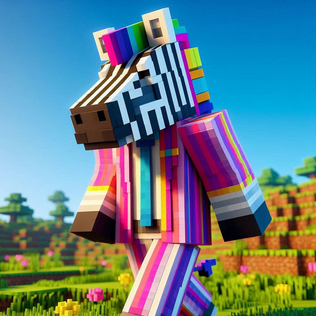 マインクラフト風 ドットが荒い大きなキューブで構成されたCGの、シマウマの顔のキャラクターが1人 大きなキューブで構成された体は紳士服で、ピンク、黄色、水色、紫、鮮やかで蛍光カラフルな縦ストライプの紳士服を着ている 歩く 背景は大きなキューブで構成された草原