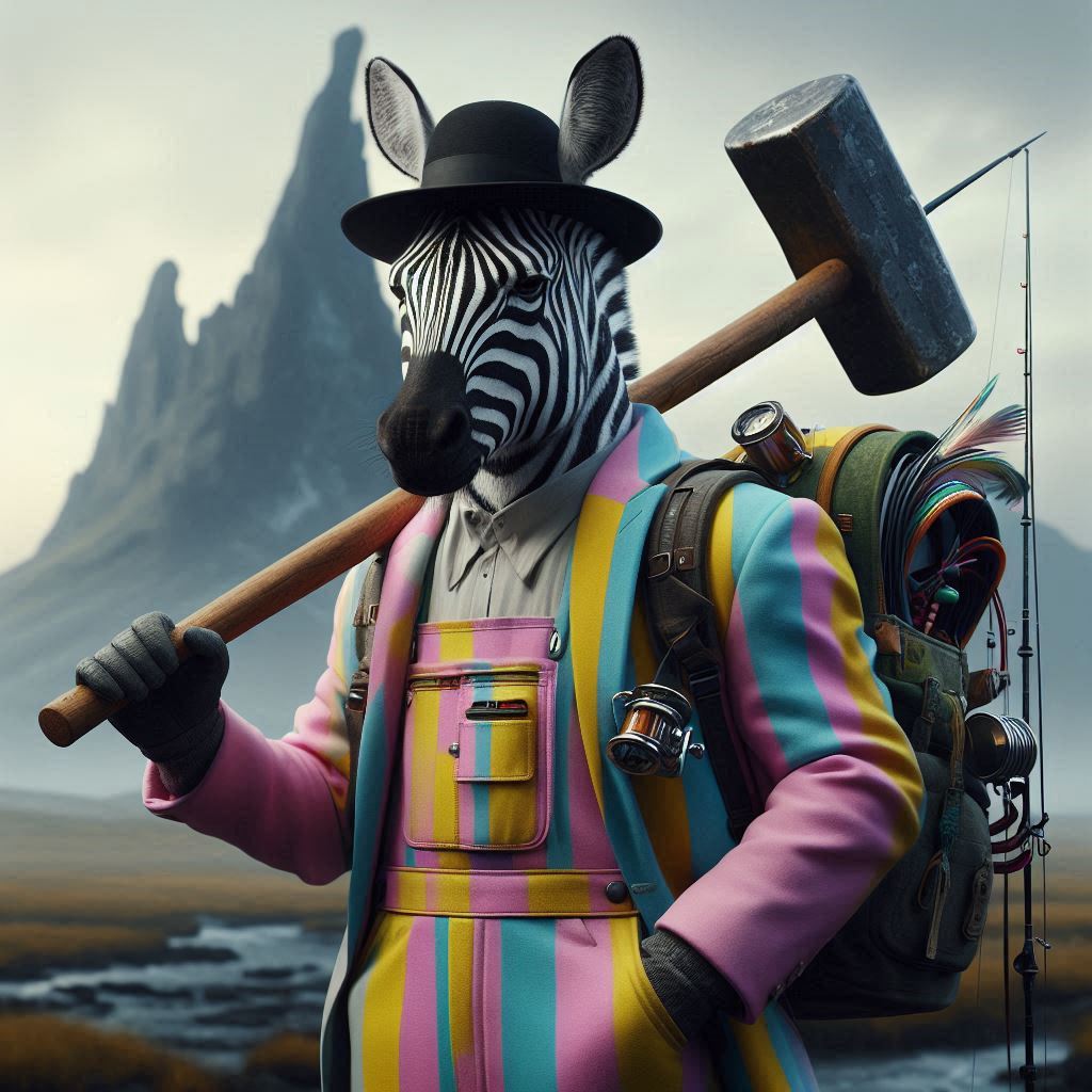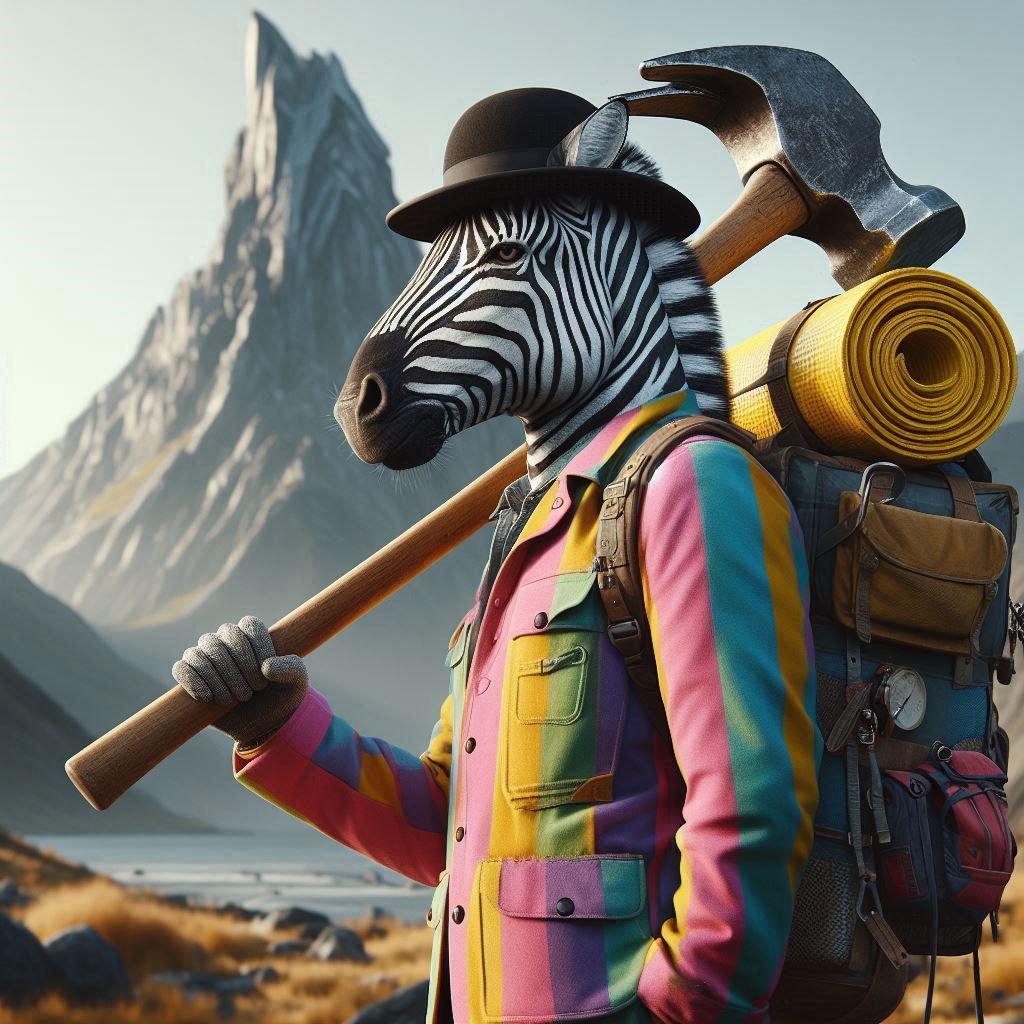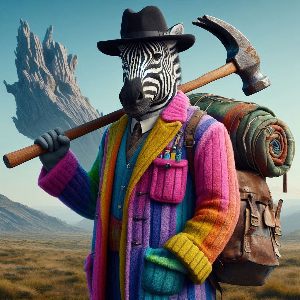 フォトリアル 現実的 写真 巨大なハンマーを持っている毛並みがリアルなモデル紳士ゼブラのキャラクター 小さな顔 スリムな体 紳士の黒いハット ピンク、黄色、水色、紫、鮮やかで蛍光カラフルな縦ストライプのオーバーオールとジャケットにポケットがたくさん付いている 一匹 大きなリュックサックを背負っている 背中に釣り竿 背景は荒野 遠くに巨大なドラゴンのような岩山
