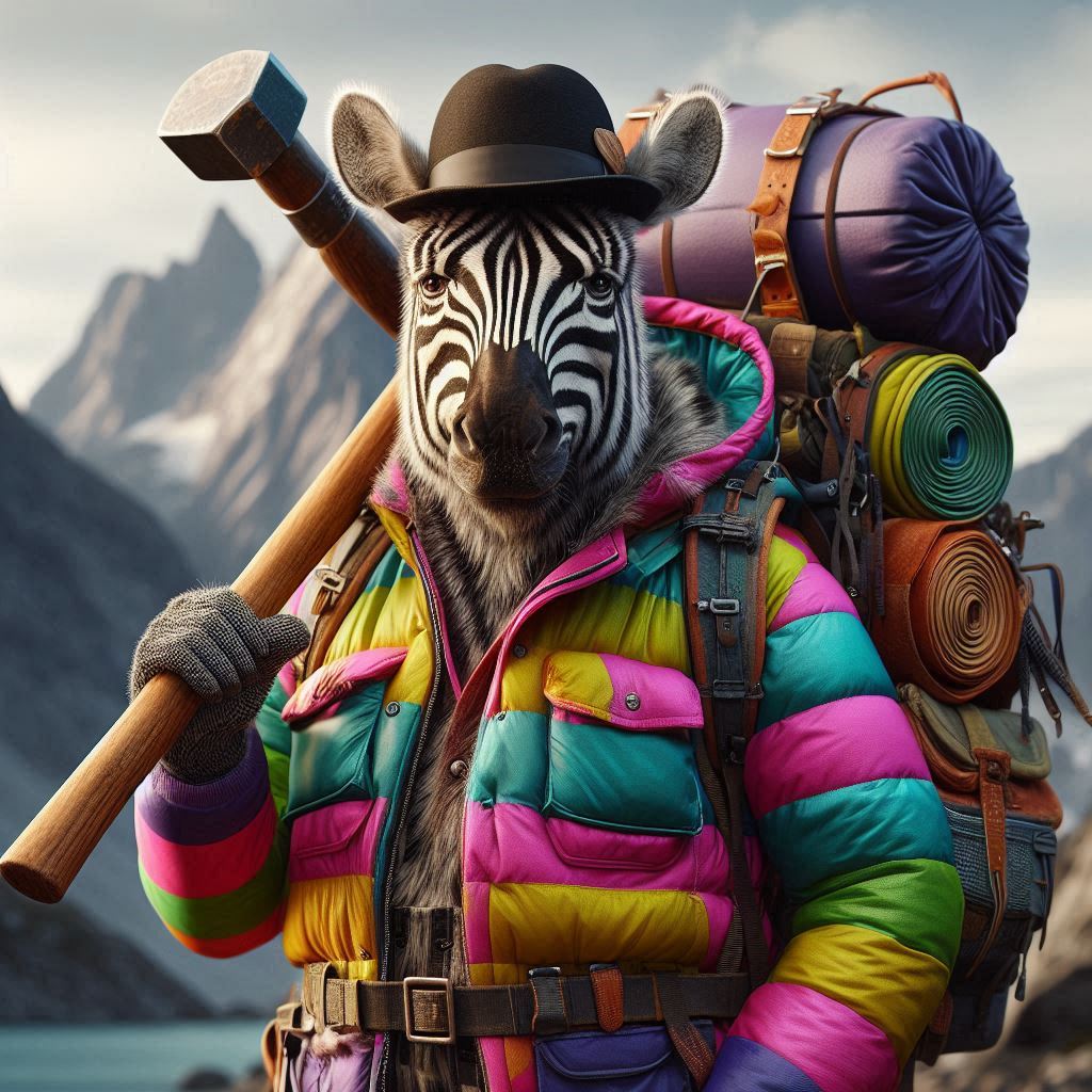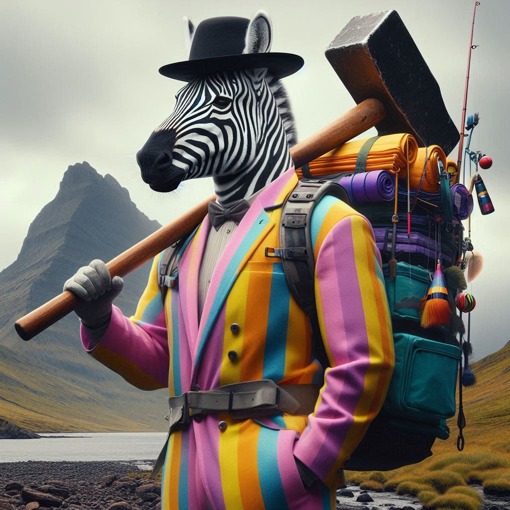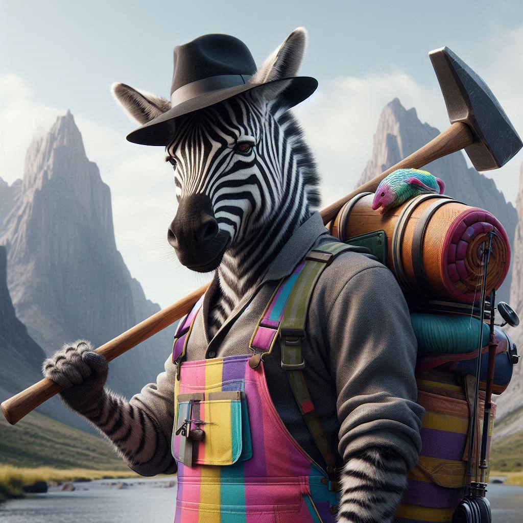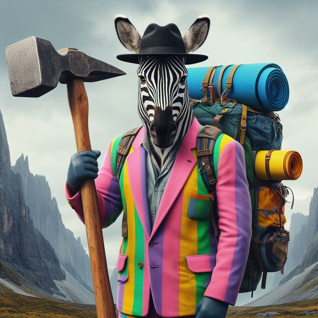 フォトリアル 現実的 写真 巨大なハンマーを持っている毛並みがリアルなモデル紳士ゼブラのキャラクター 小さな顔 スリムな体 紳士の黒いハット ピンク、黄色、水色、紫、鮮やかで蛍光カラフルな縦ストライプのオーバーオールとジャケットにポケットがたくさん付いている 一匹 大きなリュックサックを背負っている 背中に釣り竿 背景は荒野 遠くに巨大なドラゴンのような岩山