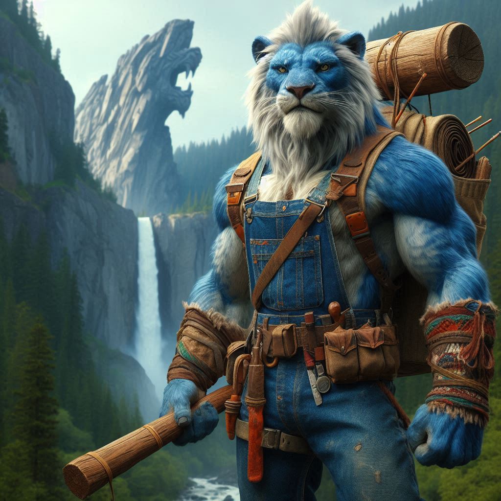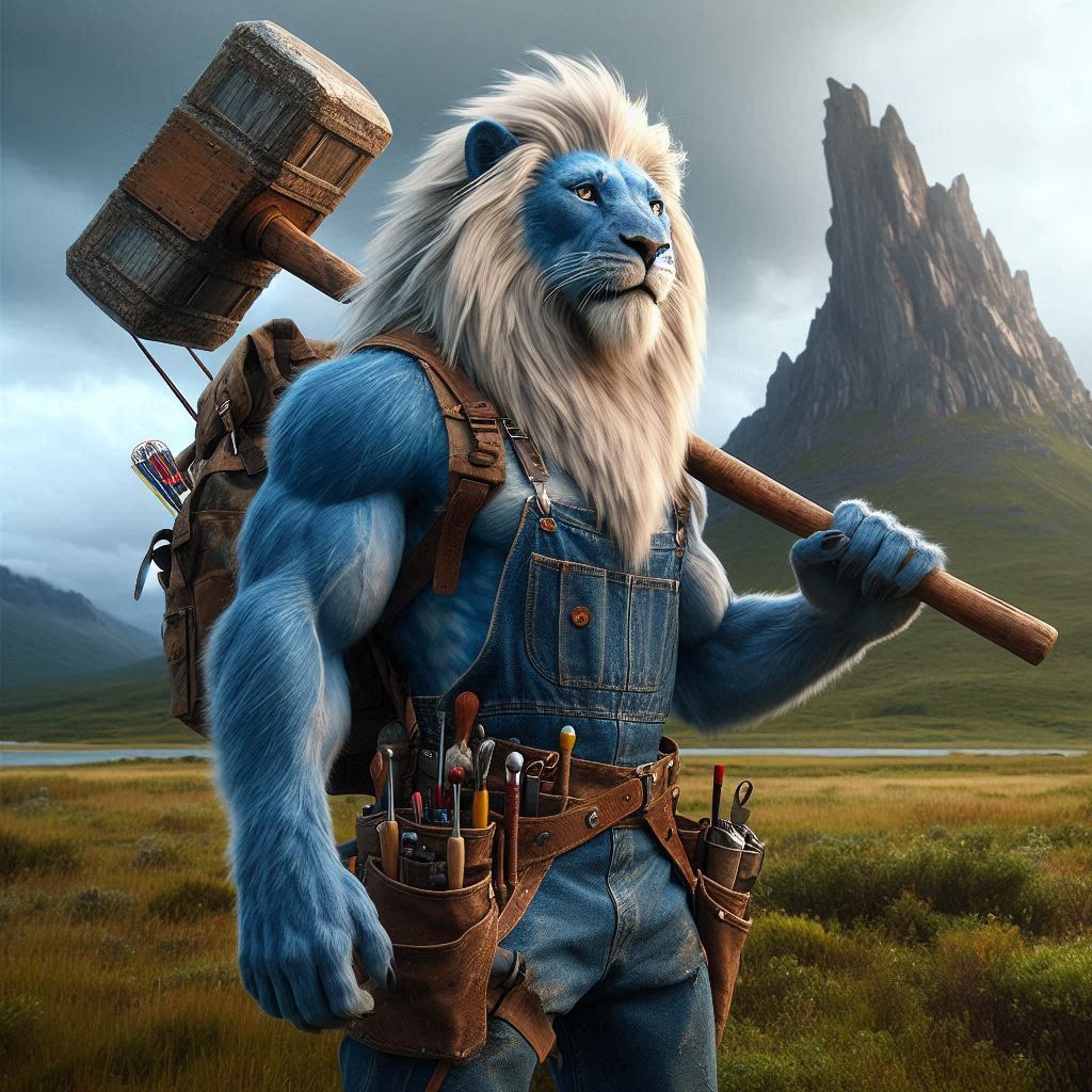 ゆうなみ:獣人モンハン ゆうなみ X Facebook はてブ LINE コピー 2025.03.232025.04.12 プロンプト: フォトリアル 現実的 写真 白いたてがみの青いライオン 細マッチョな体 巨大な木の太いハンマーを持っている 青いデニムのオーバーオールにポケットがたくさん付いている オーバーオールは大きなサイズ 民族的な装飾 一匹 大きなリュックサックを背負っている 背中に釣り竿 背景は荒野 遠くに岩山のように巨大なドラゴン