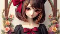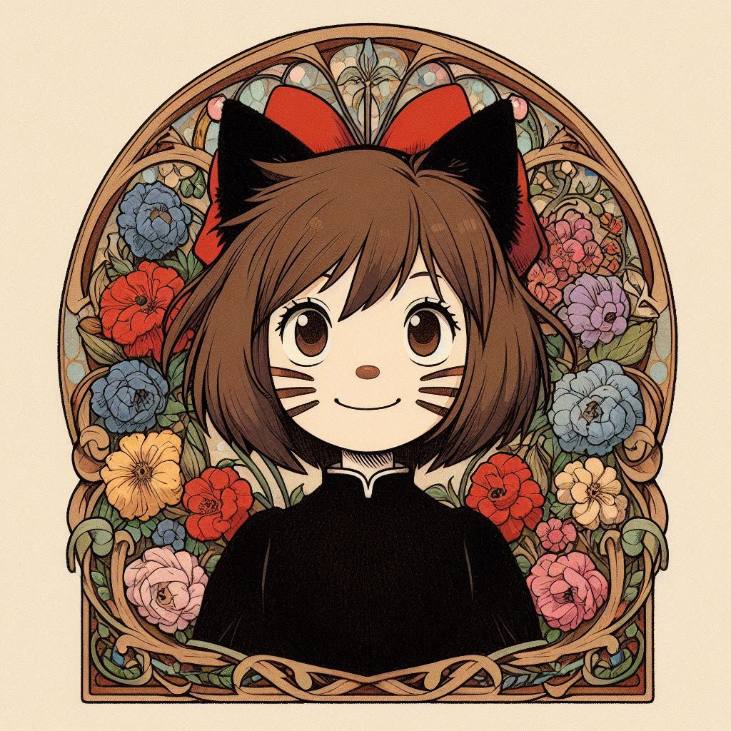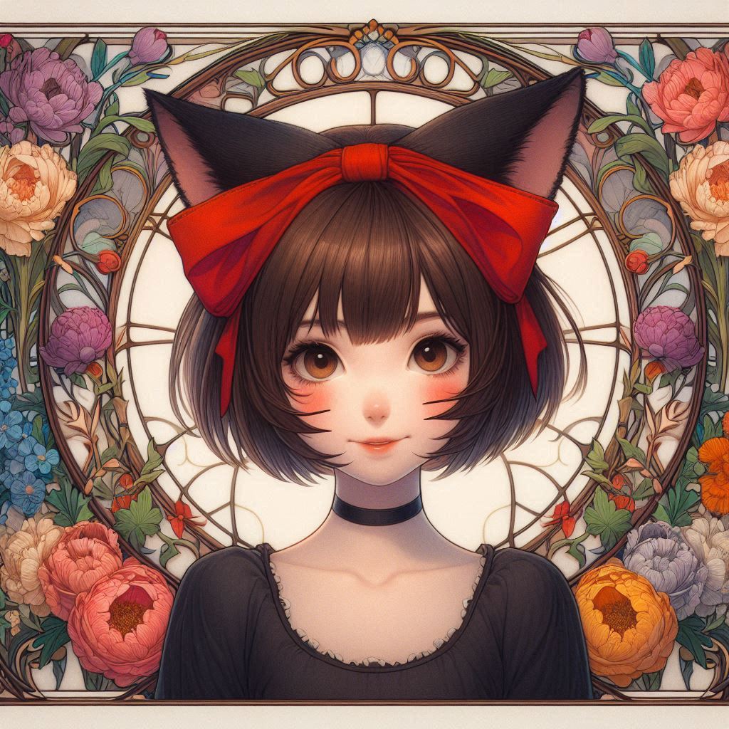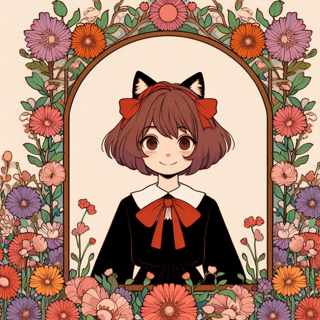 ディティールが細かい アール・ヌーヴォー風カラフルなフラワーフレーム ジブリ宮崎駿の画風 ラフ画 フレームの中に可愛い少女のキャラクター 黒いシンプルなワンピース ショートボブの茶髪に猫耳風の大きな赤いリボン風 笑顔 一人 顔を大きくレイアウトする 背景は淡い色 全体的にシンボリックな構図