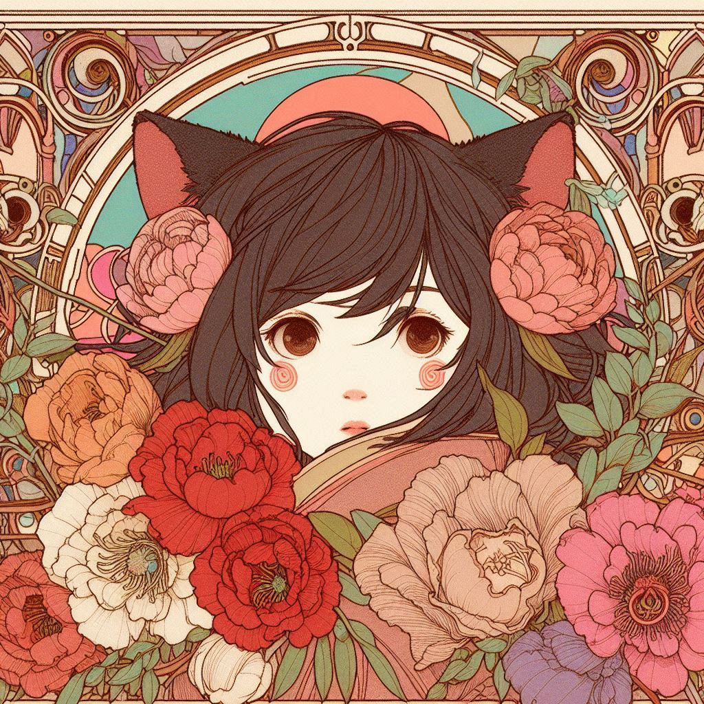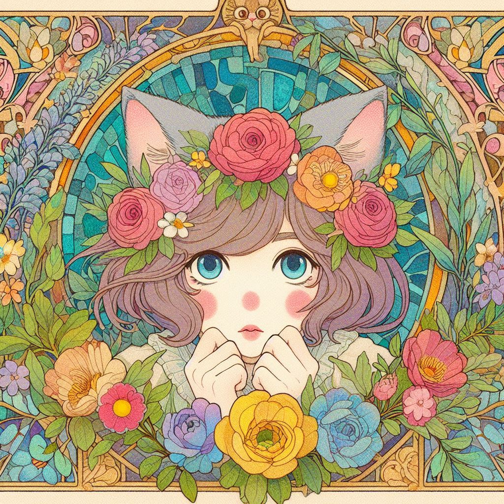 ディティールが細かい アール・ヌーヴォー風カラフルなフラワーフレーム クールジャパンの漫画風 ラフ画 フレームの中に可愛い女性 女性は猫の耳 神秘的な美しい顔 一人 顔を大きくレイアウトする 背景は淡い色 全体的にシンボリックな構図