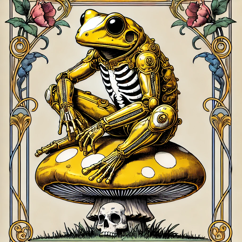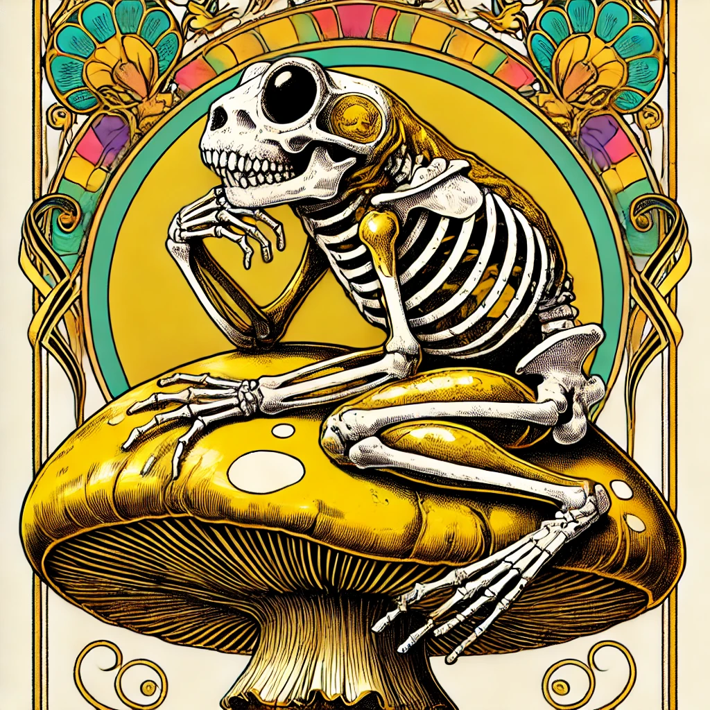 大きな金色のキノコ茸の上に乗った金色のカエルの骨。劇画の漫画の手描き感が残るラフ画タッチ。全然的なディティールを細かく。グラデーションを使わないシンプルなカラー。金色全身で白い骸骨スケルトンボディ。頭にドクロのお面を付けている。1人。カエルより大きな金色のキノコの上にいる。背景にカラフルなアール・ヌーヴォー風のお花の額縁フラワーフレームを付ける。