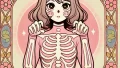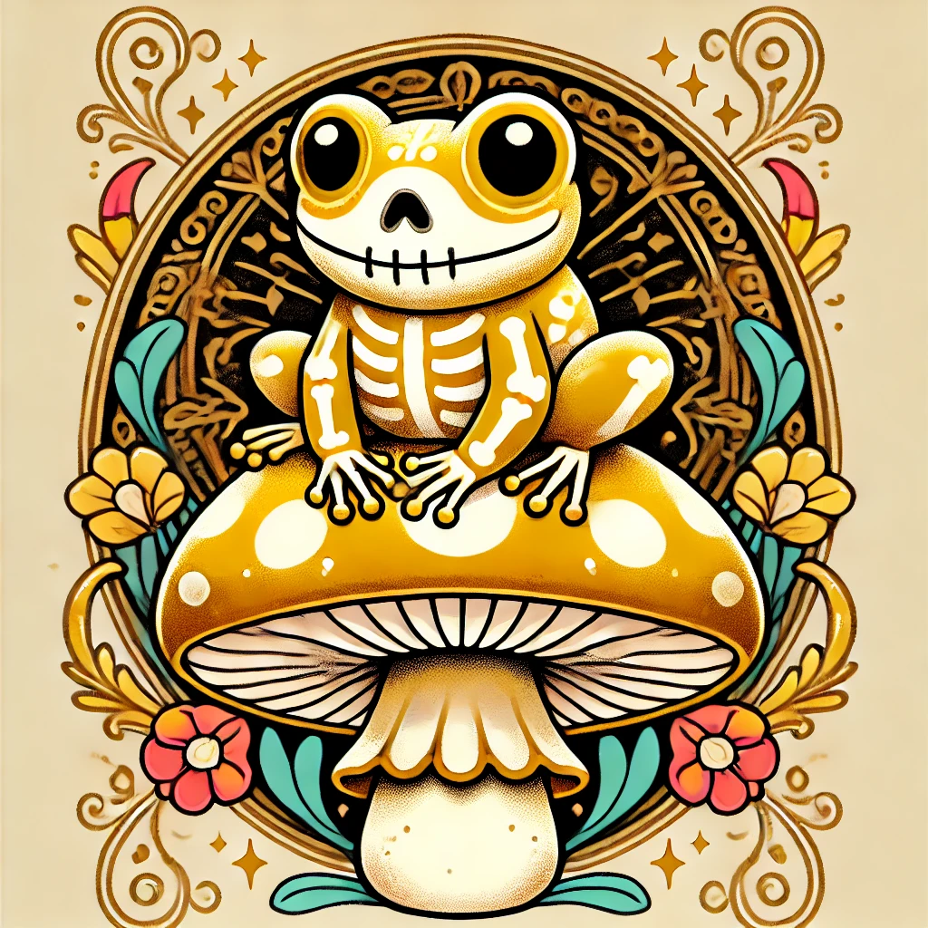 大きな金色のキノコ茸の上に乗った金色のカエルの骨。可愛い漫画の手描き感が残るラフ画タッチ。全然的なディティールを細かく。グラデーションを使わないシンプルなカラー。金色全身で白い骸骨スケルトンボディ。頭にドクロのお面を付けている。1人。カエルより大きな金色のキノコの上にいる。背景にカラフルなアール・ヌーヴォー風のお花の額縁フラワーフレームを付ける。