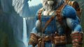 フォトリアル 現実的 写真 ハンサムなチンパンジー 男性モデル体型 ゴーグル付きの青い飛行帽 青いデニムのオーバーオールにポケットがたくさん付いている オーバーオールは大きなサイズ 一匹 巨大なハンマーを持っている 大きなリュックサックを背負っている 背中に釣り竿 背景は荒野 遠くに巨大なドラゴンのような岩山