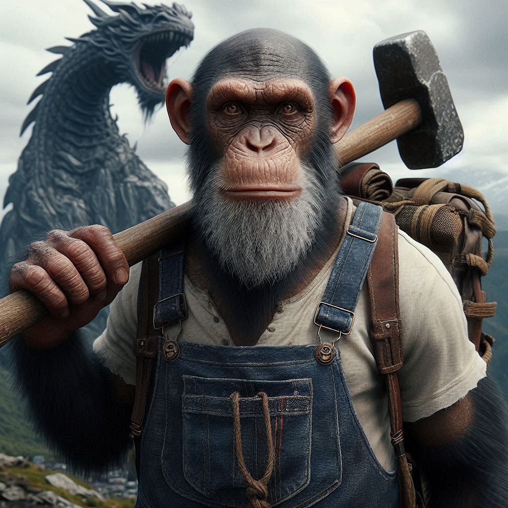フォトリアル 現実的 写真 チンパンジーの子猿 小さな顔 スリムな体 ゴーグル付きの青い飛行帽 青いデニムのオーバーオールにポケットがたくさん付いている オーバーオールは大きなサイズ 一匹 巨大な木のハンマーを持っている 大きなリュックサックを背負っている 背中に釣り竿 背景は荒野 遠くに岩山のように巨大なドラゴン