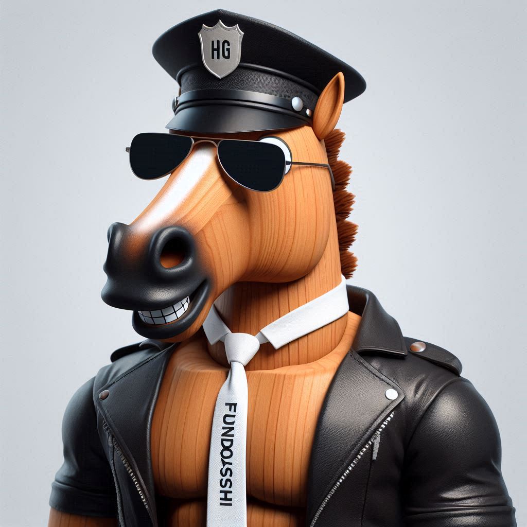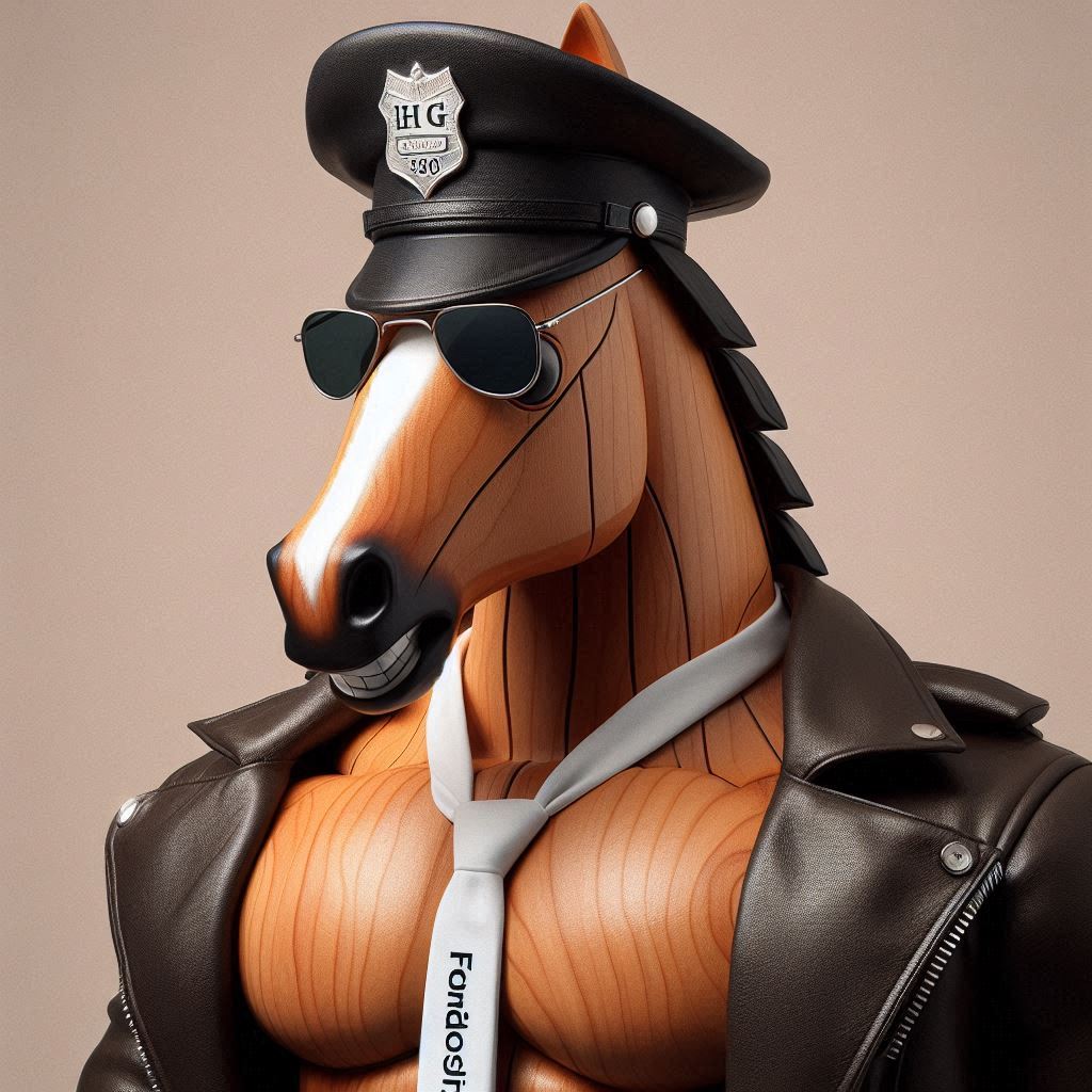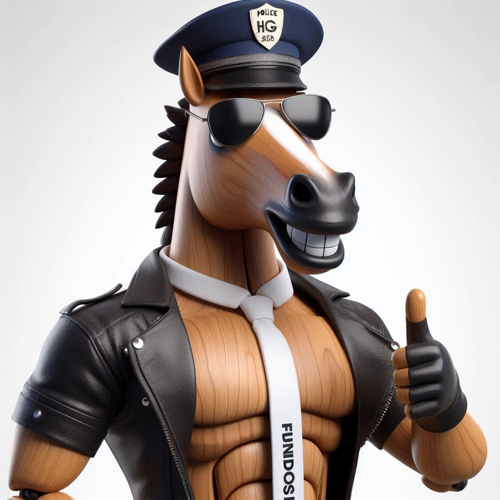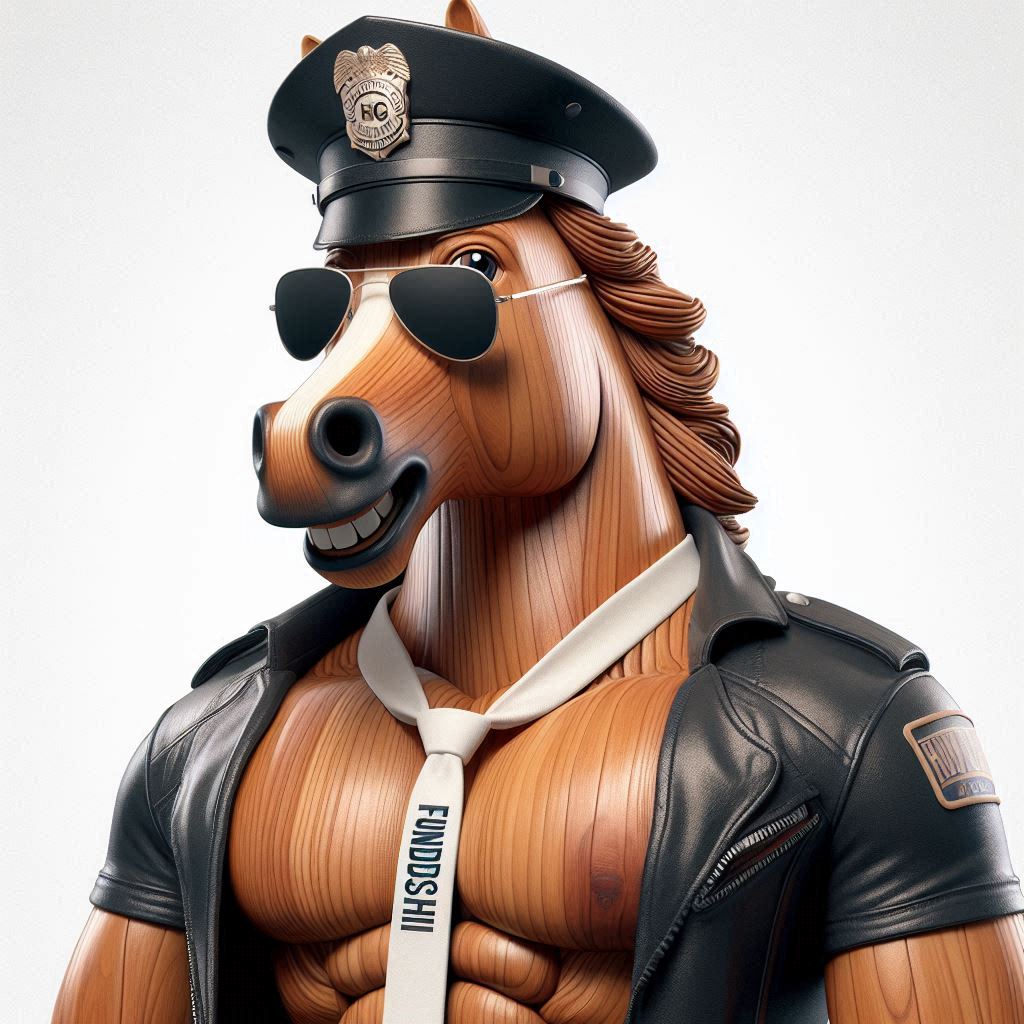 マズル:木馬ポリス マズル X Facebook はてブ LINE コピー 2025.04.22 プロンプト: フォトリアル 木馬のキャラクター 警察官の帽子 上半身は黒い革製のチョッキだけを着ている ご機嫌で陽気な笑顔とポーズ 筋肉質な男性 ハンサムで黒いサングラス 歯を見せて笑う 「fundoshi」の文字が書かれている白い包帯をマフラーのように首に巻いていて、そのマフラーが風で揺れる