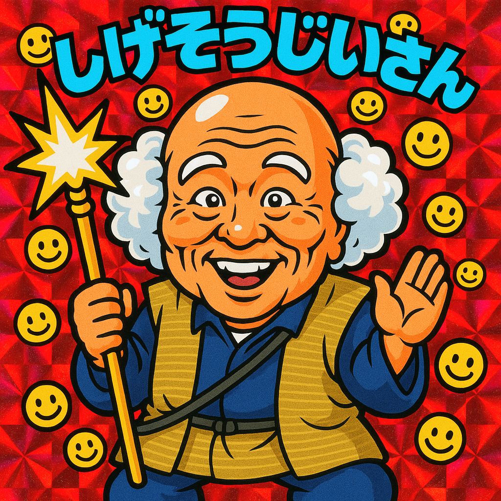 茂造:シゲ爺ビックリマン 茂造・ゴリ子 X Facebook はてブ LINE コピー 2025.05.15 プロンプト: 笑顔の老人男性の写真をもとに、1980年代のビックリマンシール風にイラスト化してください。豪華な赤いホログラムの背景、ポップなハイライト、デフォルメされたコミカルな雰囲気でお願いします。キャラクターは天の神様にアレンジしてください。画像の上部にキャラクター名『しげぞうじいさん』を目立つフォントで入れてください。背景にスマイルマークを散りばめてください。