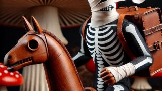 プロンプト:フォトリアル フィギュア 人形 一人 覆面レスラー 顔だけ包帯ミイラマスク 包帯が風でなびく レスラーマスク ドクロマスク 体は全身タイツ 黒いタイツ スケルトンタイツ 三角木馬にライド 木製の馬 背景に大きなキノコか生えている