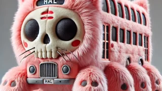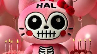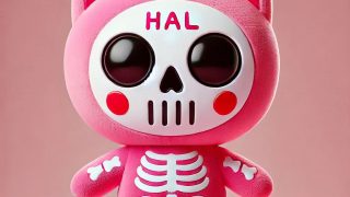 プロンプト:ピンクの猫のぬいぐるみ 可愛いメス猫 キャラクター マスコット 頭が大きい 身体が小さい 小さくて丸いフォルム 赤丸のほっぺた ドクロマスク 全身タイツ ピンクのスケルトンタイツ 額に「HAL」の字 一匹 フォトリアル7 pin...