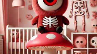 プロンプト:可愛いぬいぐるみ ひとつの赤い目玉に体がついた妖怪 キャラクター マスコット 頭が大きい 身体が小さい 小さい 全身タイツ ピンクのスケルトンタイツ ピンクのシンプルなシルエットのドクロ頭巾 一匹 フォトリアル ぬいぐるみは子供...