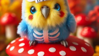 プロンプト:フォトリアル 可愛い少女のフィギュア モダンなセキセイインコ風デザインのマスク 黄色い頭 マスクの上に可愛いドクロのお面 青い全身タイツに白いスケルトン模様 両手が鳥の翼と一体化している 1匹 女性は赤いキノコの上に座っている ...