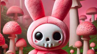 プロンプト:ピンクのウサギのぬいぐるみ 可愛いうさぎ キャラクター マスコット 頭がとても大きい 身体がとても小さい 小さくて丸いフォルム ドクロのマスク 全身タイツ ピンクのスケルトンタイツ フォトリアル 子供部屋に雑然と