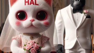 プロンプト:フォトリアル 現実的 写真 淡いピンクの猫 額に「HAL」の赤い文字 赤丸ほっぺ 小さな顔 スリムな体 可愛いドクロマスク ウェディングドレスに白いスケルトン模様 一匹 花束を持っている 背中は教会プロンプト:フォトリアル 現実...