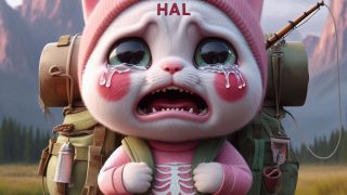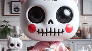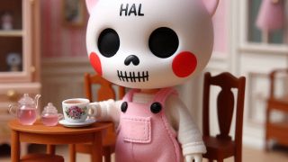 プロンプト:フォトリアル アンティークなインテリアのシルバニアファミリーのドールハウスの中に、ほっぺたがとても大きな赤丸で額に「HAL」の文字がある白い可愛気のあるドクロ風フェイスマスクを着けた淡いピンクの子猫のキャラクターフィギュアが一匹...