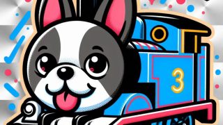 プロンプト:機関車トーマスの顔が可愛いシルバニアフィギュアのボストンテリアの子犬になっているラフ画イラスト 少しだけベロが出ている デフォルメされたマスコットキャラクターの顔はスッキリしている 犬の耳がピンと立っている 目がくりっと丸い 背...