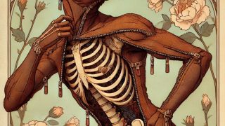 プロンプト:ブラウンのラクダ マスコット キャラクター 可愛い 漫画 手描き ラフ画 ディティールが細かい グラデーションを使わない シンプルなカラー 極端に頭が大きい 極端に体が小さい 全身ブラウン 骸骨 スケルトンタイツ 顔はラクダ 長...