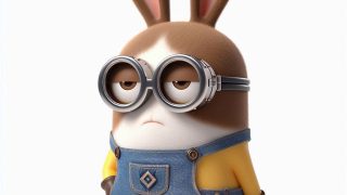 プロンプト:フォトリアル 現実的 写真 かっこいい茶色と白のウサギ 小さな顔 スリムな体 ゴーグル付きの紺色の飛行帽 紺色のオーバーオールにポケットがたくさん付いている オーバーオールは大きなサイズ 一匹 巨大なハンマーを持っている 大きな...