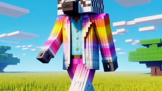 むぎむぎ むぎむぎ:シマウママイクラ プロント:マインクラフト風 ドットが荒い大きなキューブで構成されたCGの、シマウマの顔のキャラクターが1人 大きなキューブで構成された体は紳士服で、ピンク、黄色、水色、紫、鮮やかで蛍光カラフルな縦ストライプの紳士服を着ている 歩く 背景は大... 2025.05.12 むぎむぎ