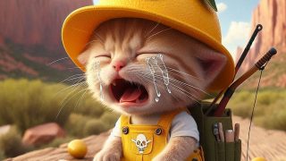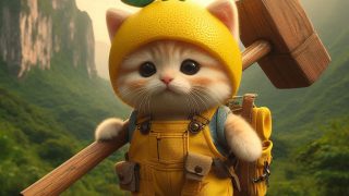 プロンプト:頭から柚子のヘタが生えている黄色い猫のラフ画イラスト 黄色のオーバーオールを着た、小さい子猫のマスコットキャラクター 弓矢を持った翼のある可愛い天使のような姿 背景は白 ディティールが細かくカラフルでポップなイラスト 陽気なポー...