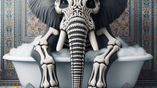 ブチャラティ ブチャラティ:ゾウショッカー プロンプト:フォトリアル 象のフィギュア 長い鼻 可愛いドクロ顔 巨大な体 黒い全身 白いスケルトン模様 1匹 背景はトルコ宮殿模様の広い大浴場 泡がいっぱい 浴槽につかる 床にレモンが散らばっている 2025.01.13 ブチャラティ