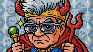 プロンプト:サングラスの男性の写真をもとに、1980年代のビックリマンシール風にイラスト化してください。豪華なシルバーのホログラムの背景、ポップなハイライト、デフォルメされたコミカルな雰囲気でお願いします。キャラクターは悪魔の王様にアレンジ...