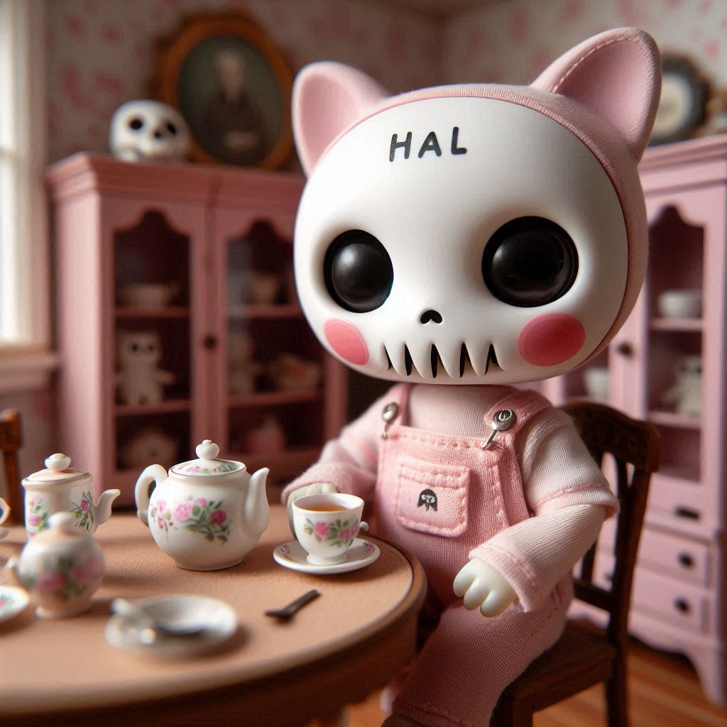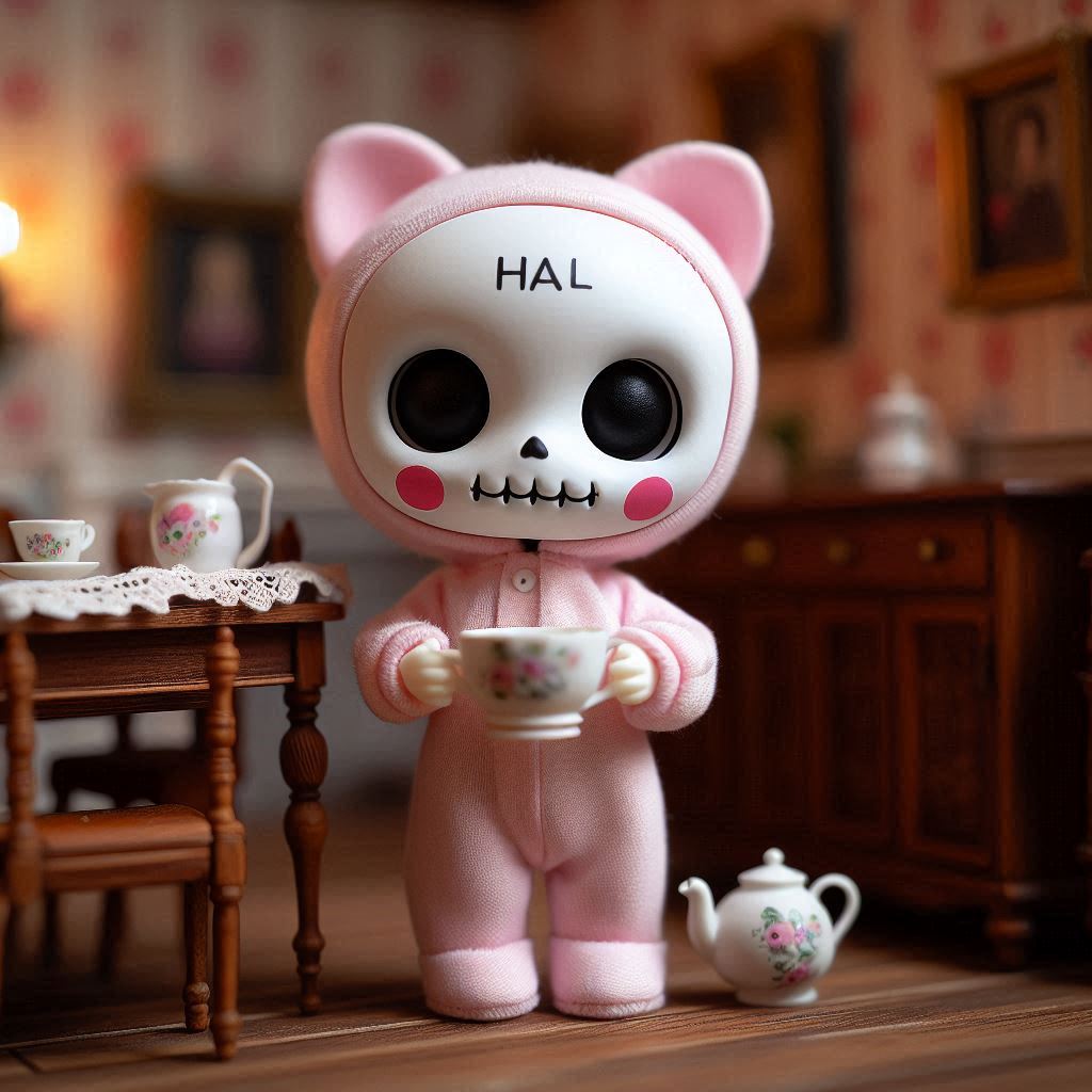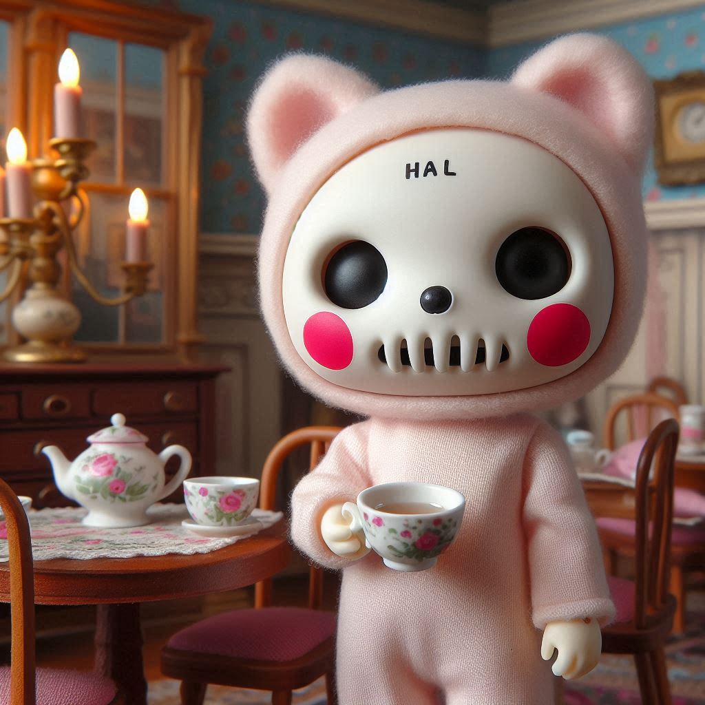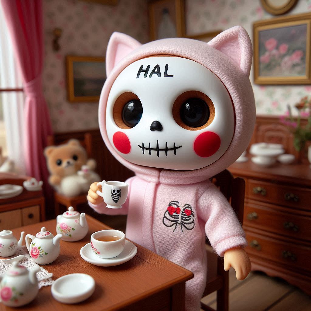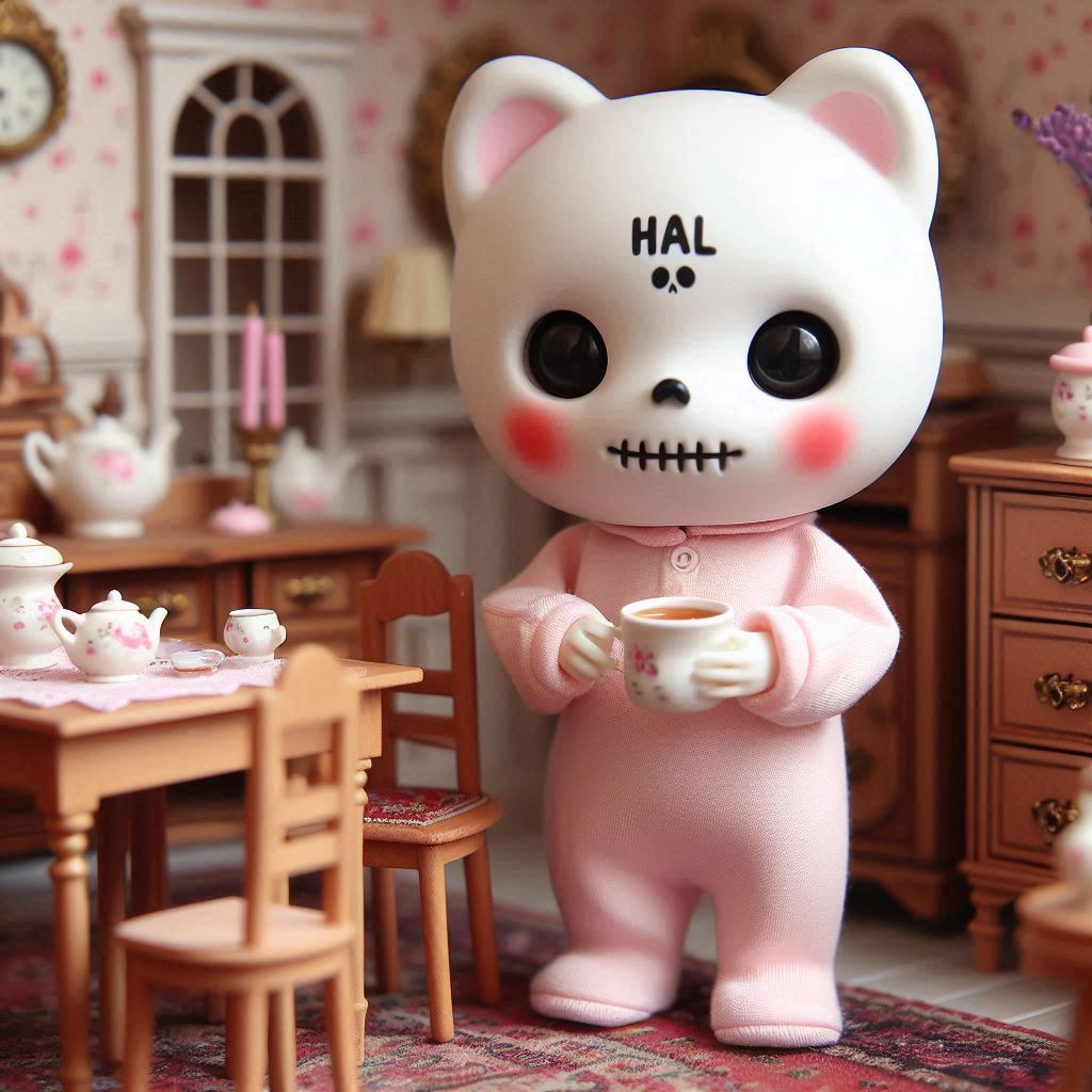 フォトリアル リトルボディのフィギュア アンティークなインテリアのシルバニアファミリーのドールハウスの中に、ほっぺたがとても大きな赤丸で額に「HAL」の文字がある白い可愛気のあるドクロ風フェイスマスクを着けた淡いピンクの体が小さな子猫のキャラクターフィギュアが一匹 ダイニングルームで紅茶を飲んでいる 淡いピンクのつなぎ服はスケルトンタイツ