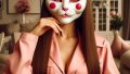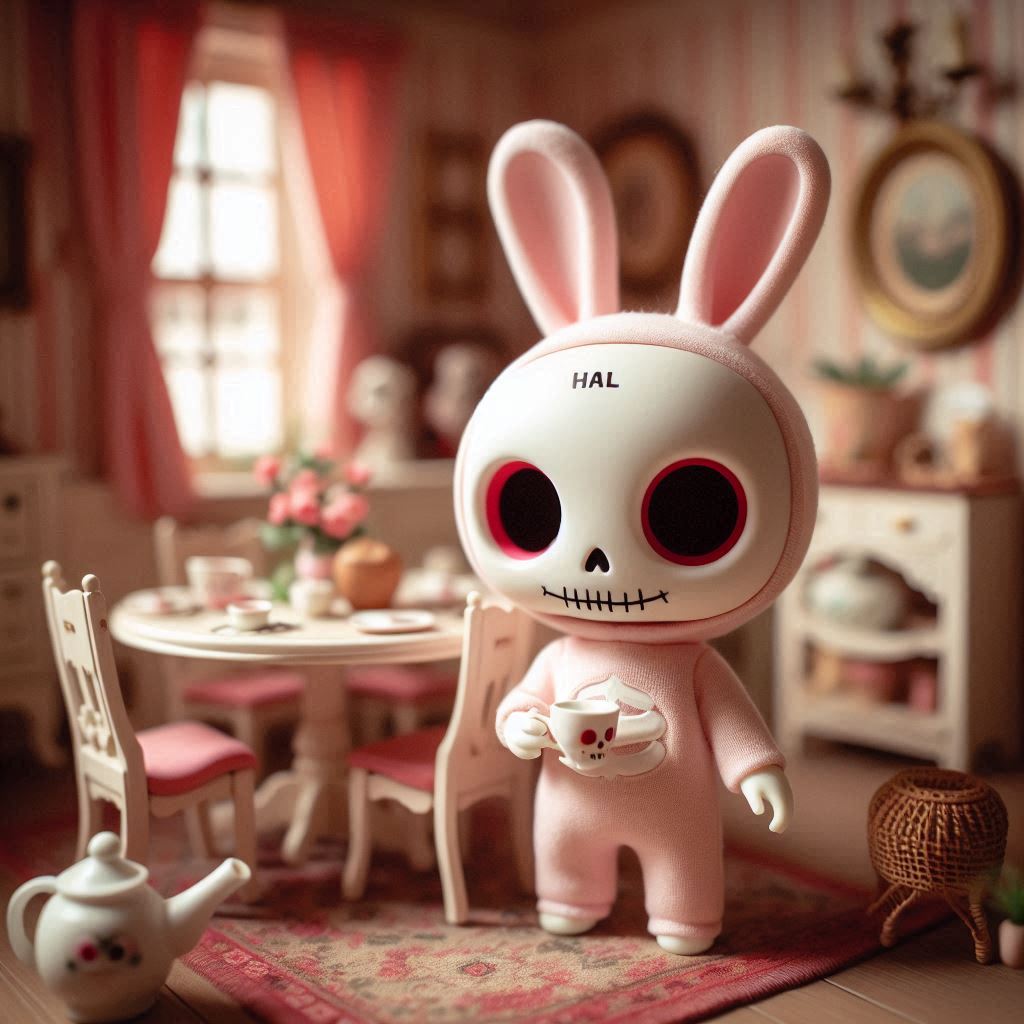 フォトリアル リトルボディのフィギュア アンティークなインテリアのシルバニアファミリーのドールハウスの中に、ほっぺたがとても大きな赤丸で額に「HAL」の文字がある白い可愛気のあるドクロ風フェイスマスクを着けた淡いピンクの体が小さなウサギのキャラクターフィギュアが一匹 ダイニングルームで紅茶を飲んでいる 淡いピンクのつなぎ服はスケルトンタイツ