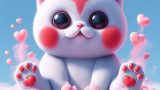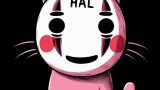 フォトリアル リトルボディのフィギュア アンティークなインテリアのシルバニアファミリーのドールハウスの中に、ほっぺたがとても大きな赤丸で額に「HAL」の文字がある白い可愛気のあるドクロ風フェイスマスクを着けた淡いピンクの体が小さな子猫のキャラクターフィギュアが一匹 ダイニングルームで紅茶を飲んでいる 淡いピンクのつなぎ服はスケルトンタイツ