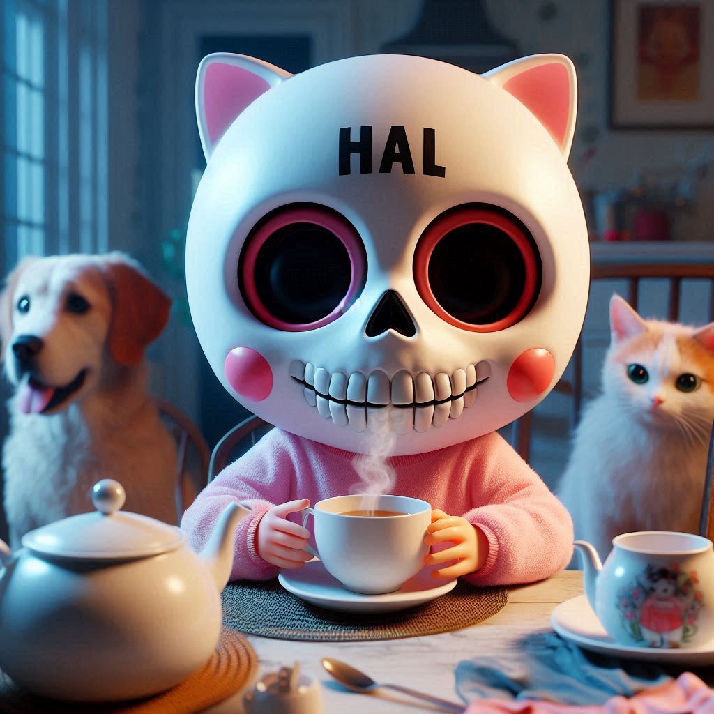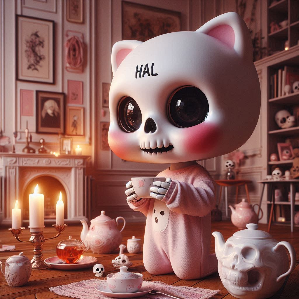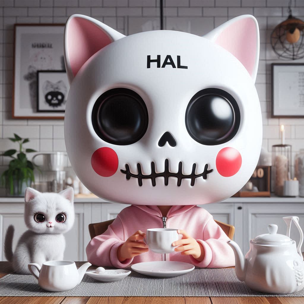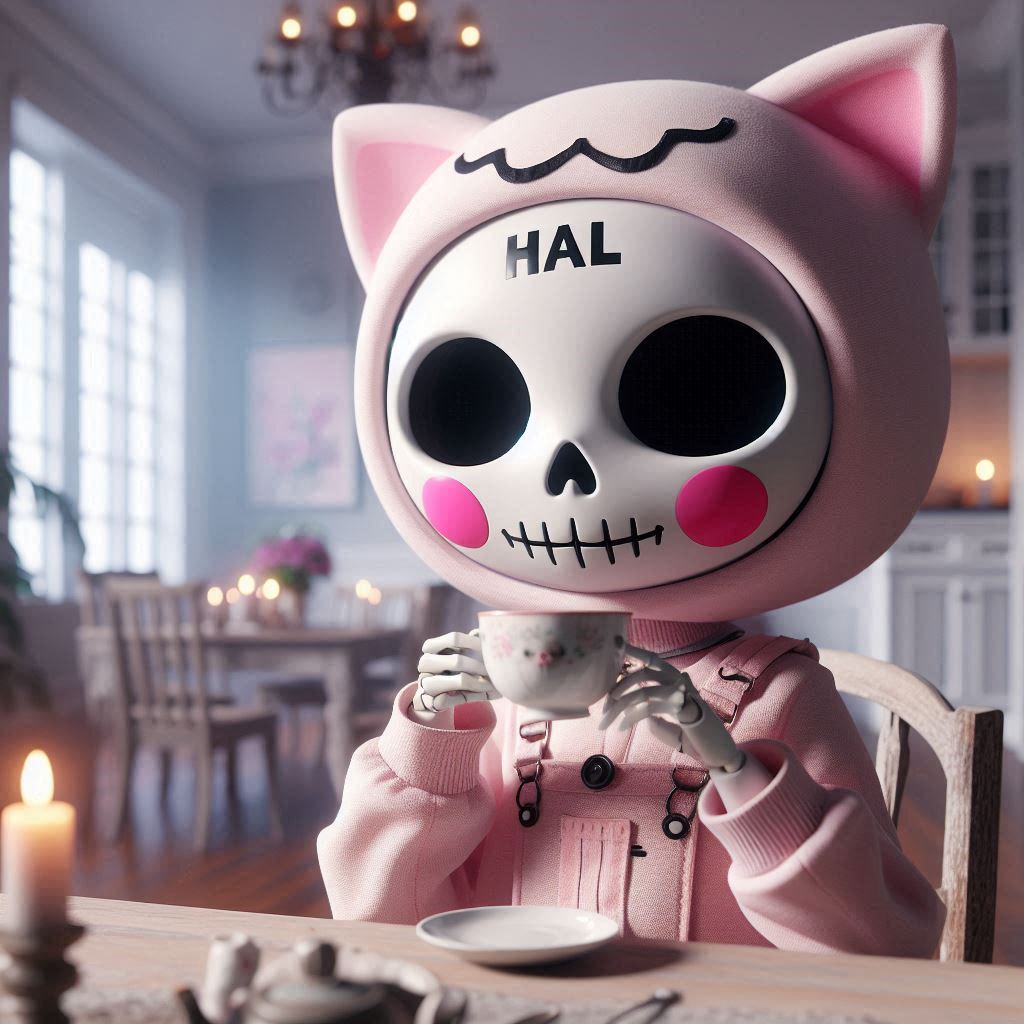 HAL:ネコスカルお紅茶 HAL X Facebook はてブ LINE コピー 2025.04.142025.04.16 プロンプト: フォトリアル ほっぺたがとても大きな赤丸で額に「HAL」の文字がある白い可愛いドクロマスクの女性的な淡いピンクの猫 頭が大きい 一匹 ダイニングルームで紅茶を飲んでいる 淡いピンクのつなぎ服はスケルトン模様 朝