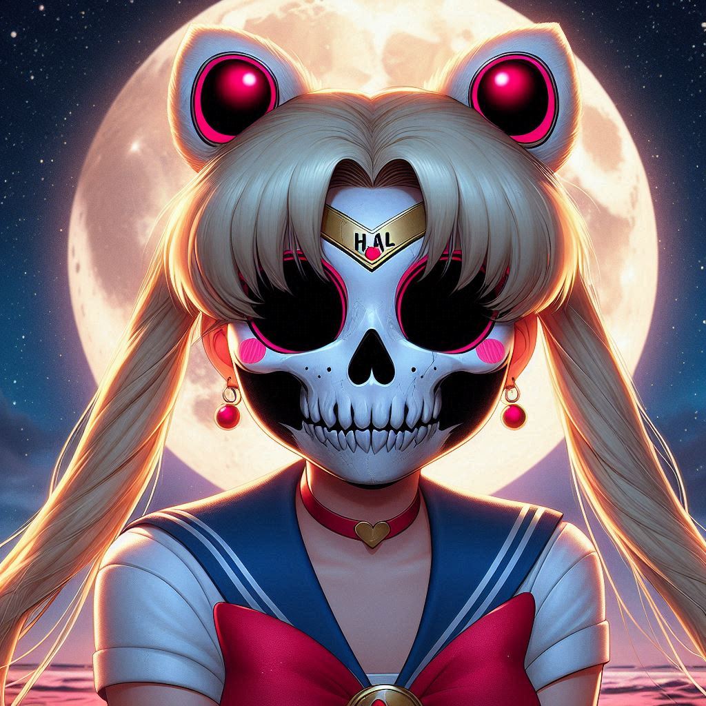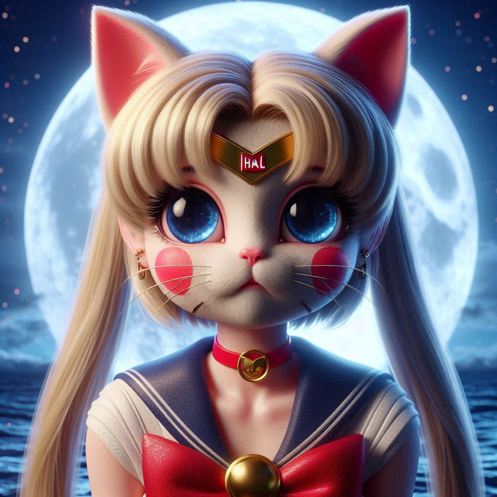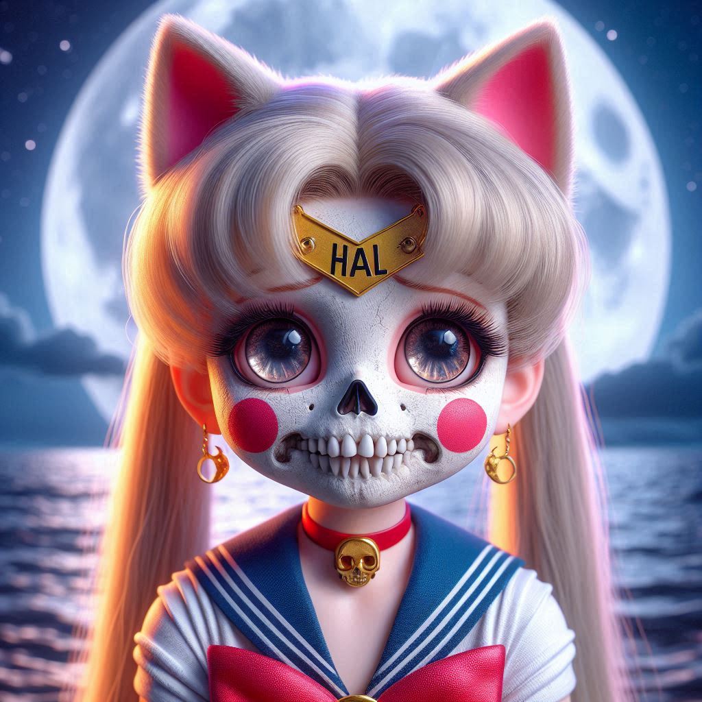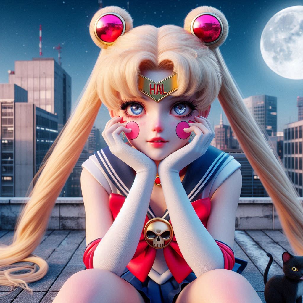猫耳セーラームーン「HAL」で、「HAL」の大きな文字が額にある、頬のチークが大きな赤丸の、猫耳がある、シルバニアドクロマスクの、猫耳があるセーラームーンで、猫耳があり、赤丸チークで、孤独な座り方で、背景は満月と星空で、チークに赤丸があり、フォトリアルで、現実的で、猫耳があり、実写で、「HAL」の表記が額にある、名前は「HAL」で、猫耳があり、チークが赤丸で、グラマーなセーラームーン「HAL」