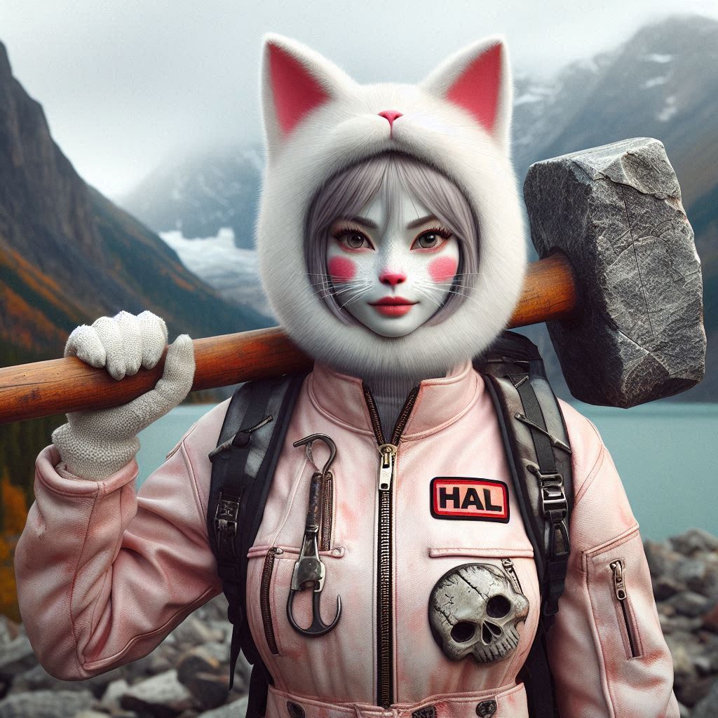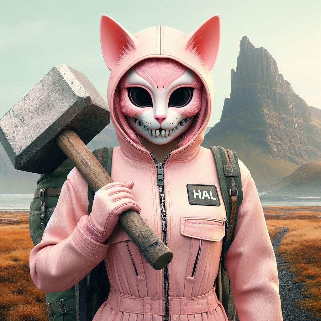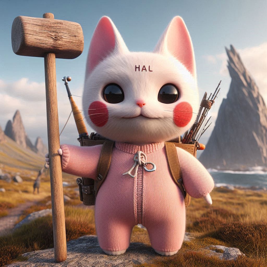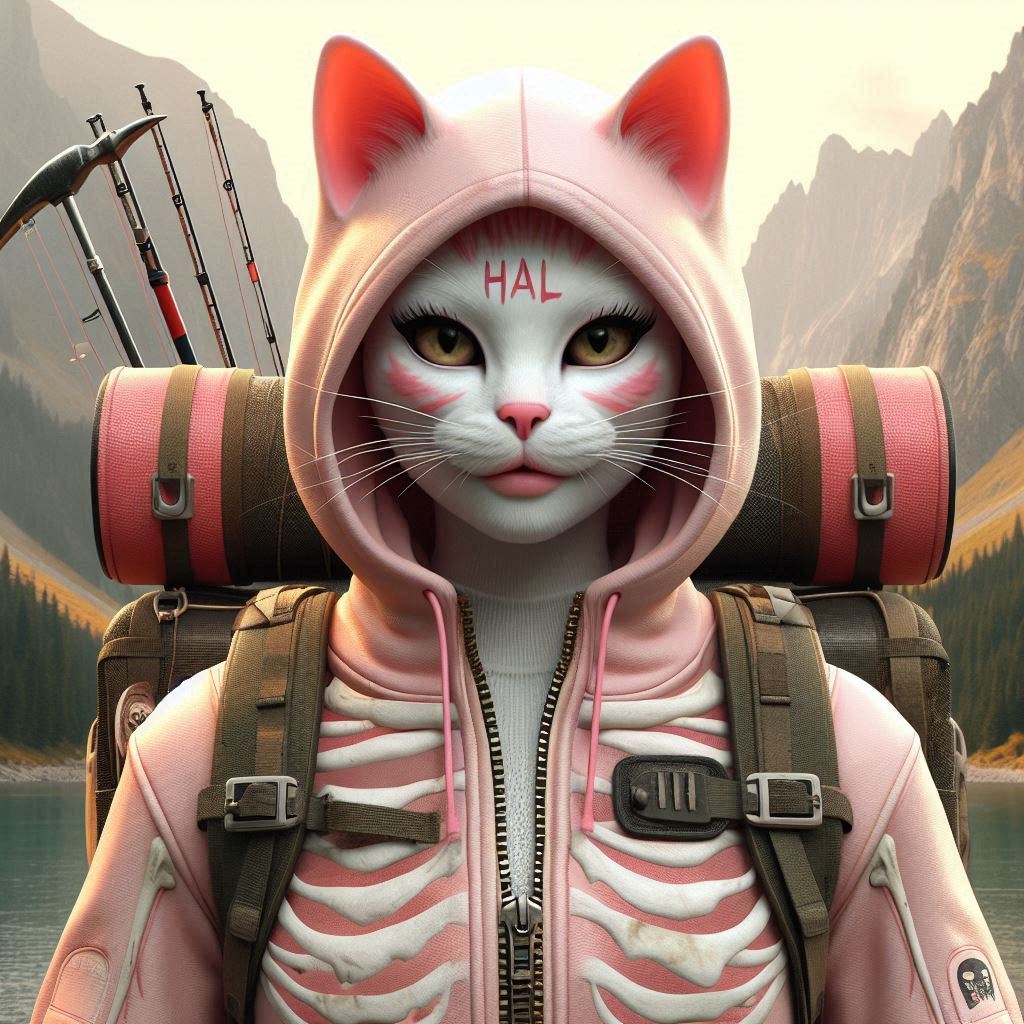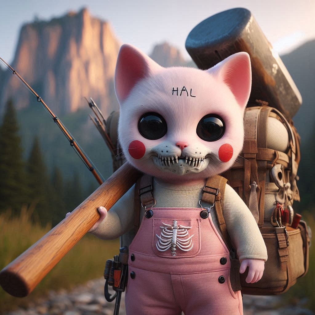 Photorealistic, realistic, photograph, pale pink cat, round red cheeks, the word “HAL” written on the forehead, small head, small cat face, slim body, round red cheeks, cute skull mask, round red cheeks, pale pink overalls, white skeleton pattern on the overalls, large size overalls, one, holding a huge wooden hammer, carrying a large backpack, fishing rod on its back, wilderness in the background, huge dragon like rock mountain in the distance