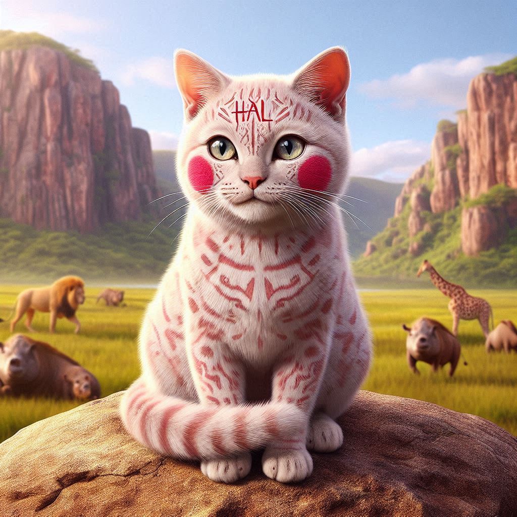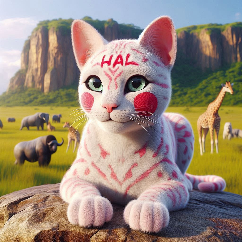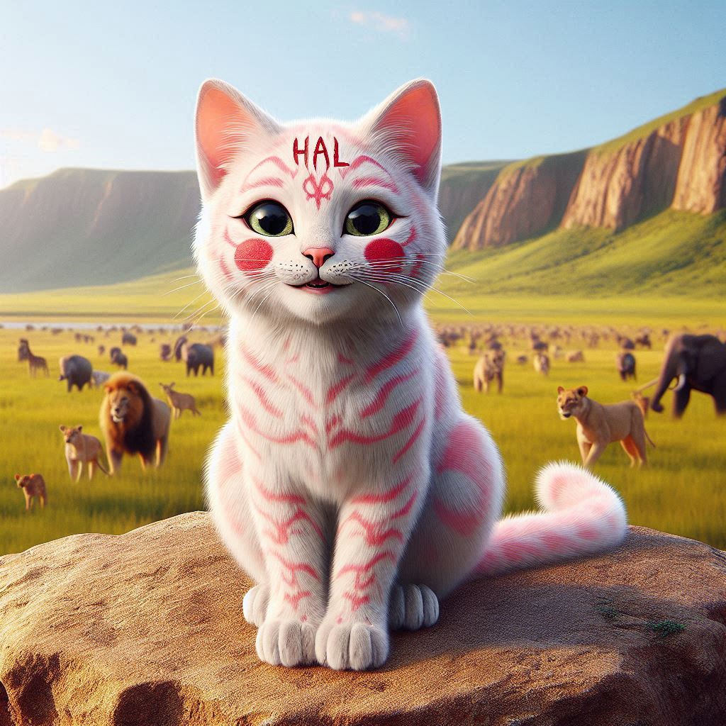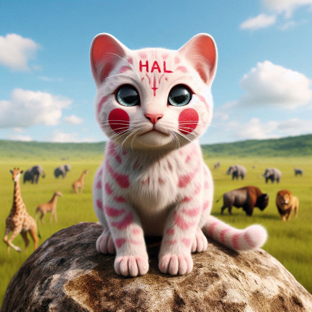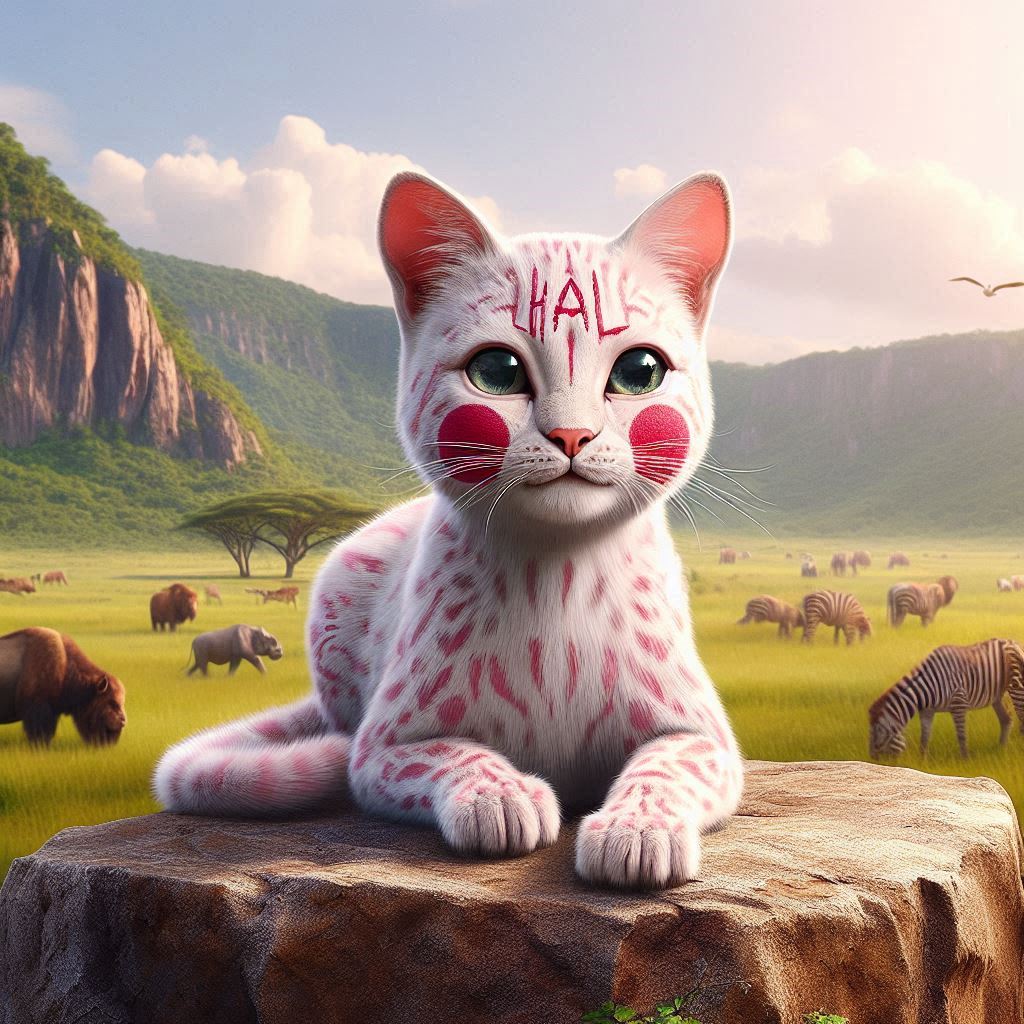 フォトリアル 巨大な岩の上に座っている女性的な淡いピンクのワイルドなメスのヤマネコ 「HAL」のテキストがヤマネコの額に赤字で表記 おでこに「HAL」 大きな赤丸チークがほっぺたにある 赤ほっぺ 顔の模様が白いドクロ風 淡いピンクのヤマネコの体の模様がスケルトンの白い模様 鮮やかな色調 体のラインが美しいヤマネコ 遠くの背景に仲間の動物の大群、タカ、ライオン、キリン、ゾウ、トラ、バッファロー、ゴリラ 緑の草原 青空