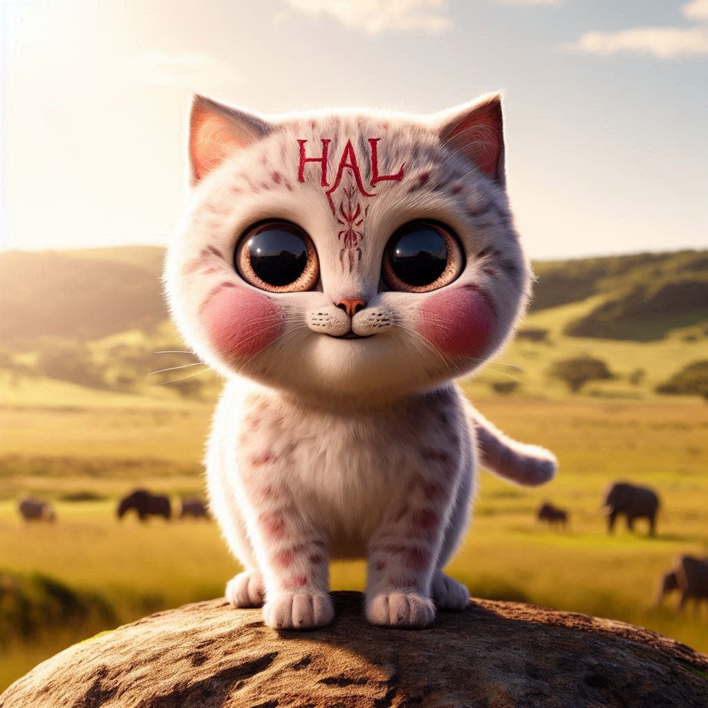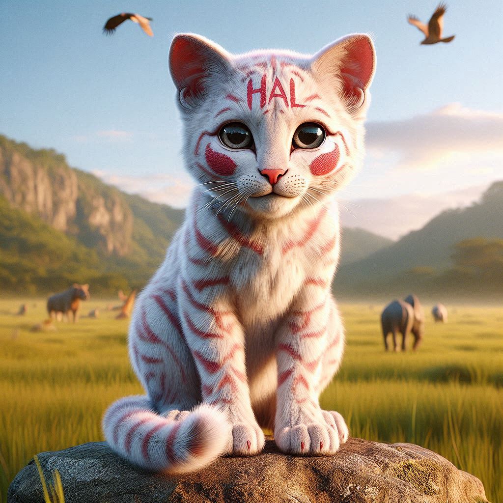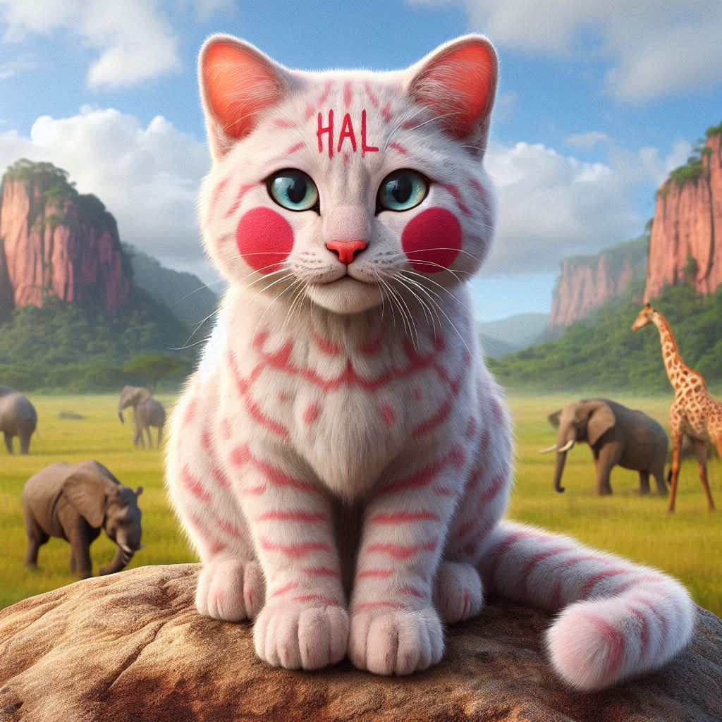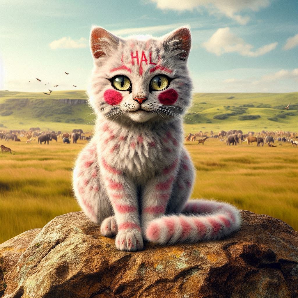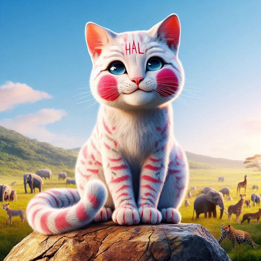 フォトリアル 巨大な岩の上に座っている女性的な淡いピンクのワイルドなメスのヤマネコ 「HAL」のテキストがヤマネコの額に赤字で表記 おでこに「HAL」 大きな赤丸チークがほっぺたにある 赤ほっぺ 顔の模様が白いドクロ風 淡いピンクのヤマネコの体の模様がスケルトンの白い模様 鮮やかな色調 体のラインが美しいヤマネコ 遠くの背景に仲間の動物の大群、タカ、ライオン、キリン、ゾウ、トラ、バッファロー、ゴリラ 緑の草原 青空