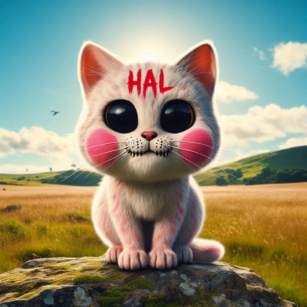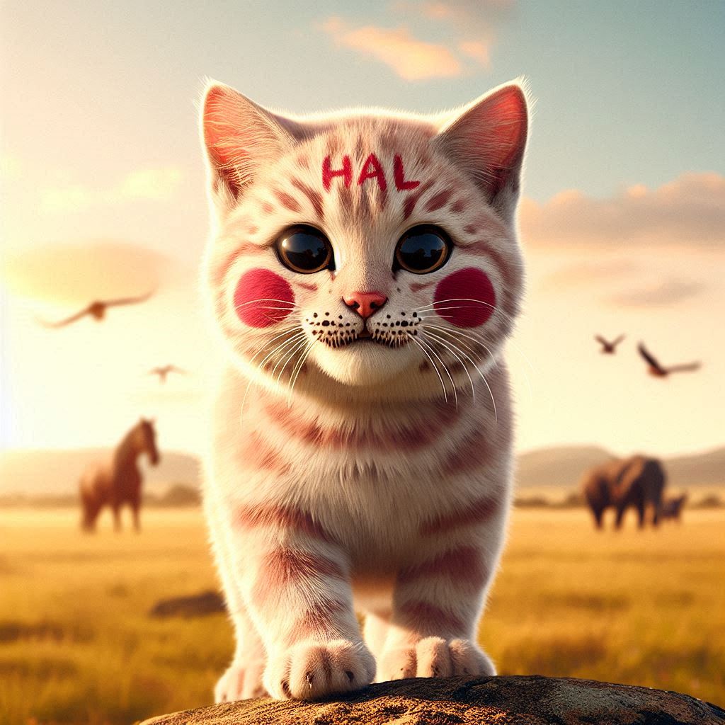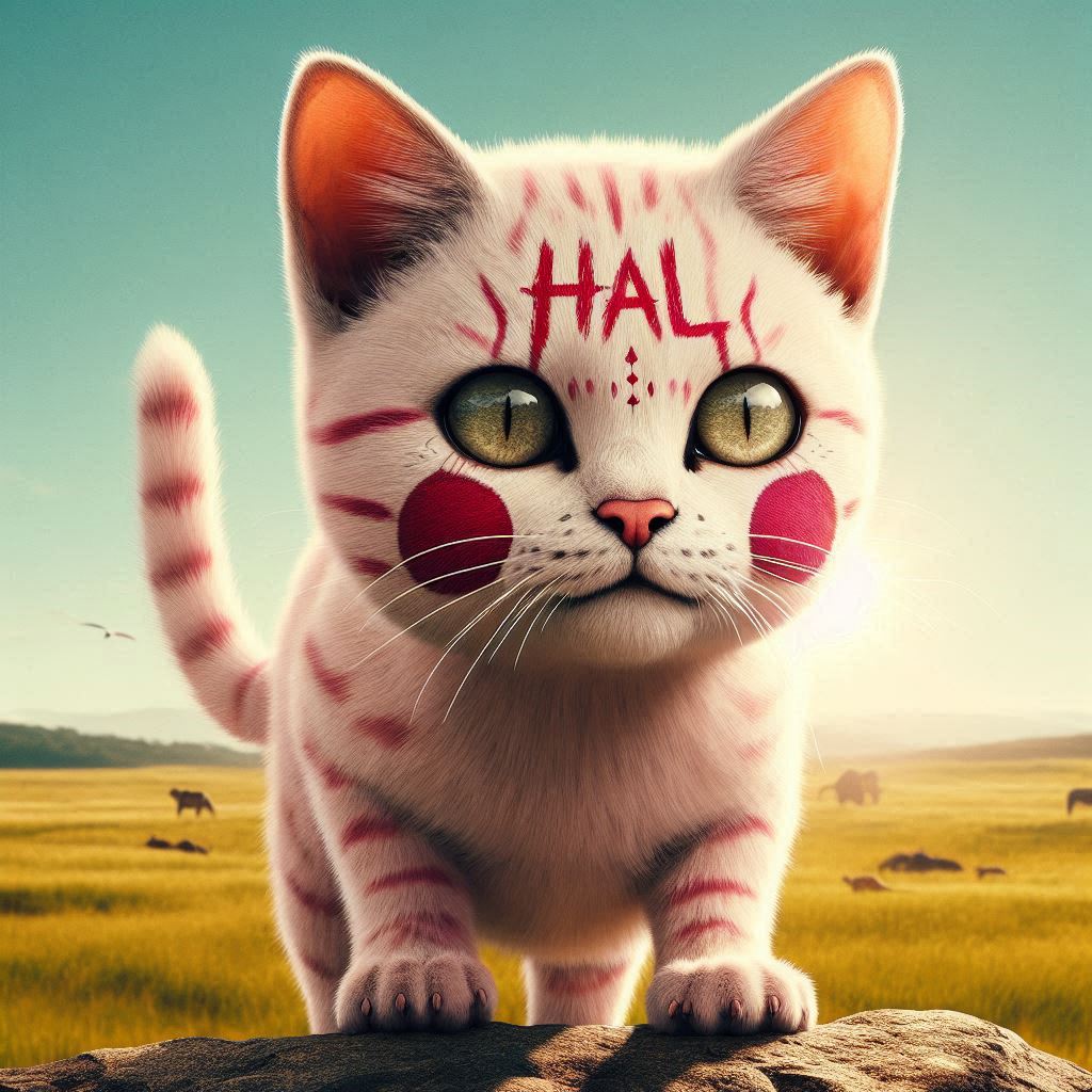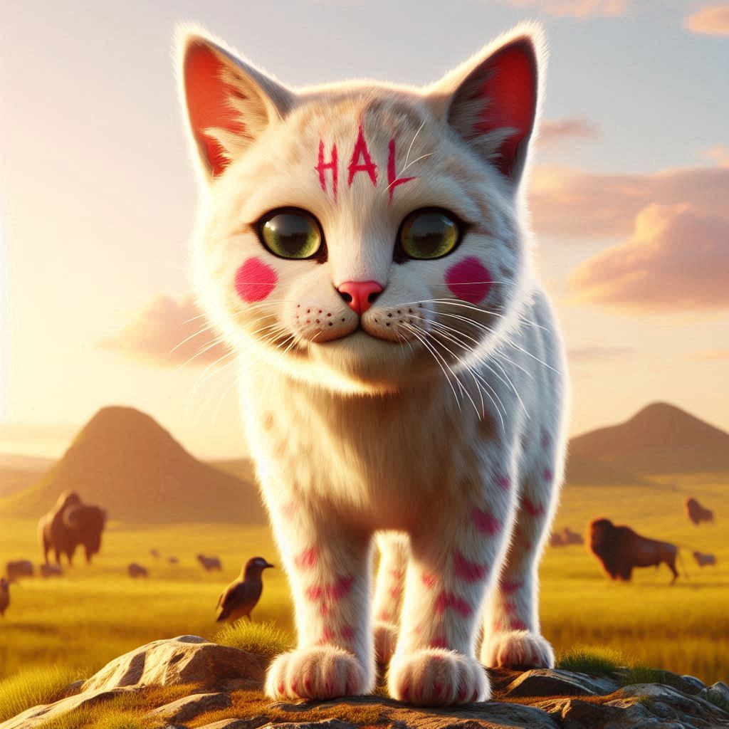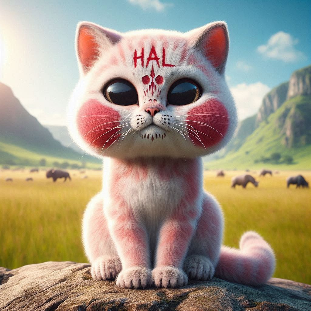 フォトリアル 巨大な岩の上に座っている女性的な淡いピンクのワイルドなメスのヤマネコ 「HAL」のテキストがヤマネコの額に赤字で表記 おでこに「HAL」 大きな赤丸チークがほっぺたにある 赤ほっぺ 顔の模様が白いドクロ風 淡いピンクのヤマネコの体の模様がスケルトンの白い模様 鮮やかな色調 体のラインが美しいヤマネコ 遠くの背景に仲間の動物の大群、タカ、ライオン、キリン、ゾウ、トラ、バッファロー、ゴリラ 緑の草原 青空