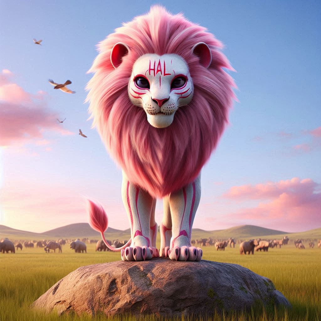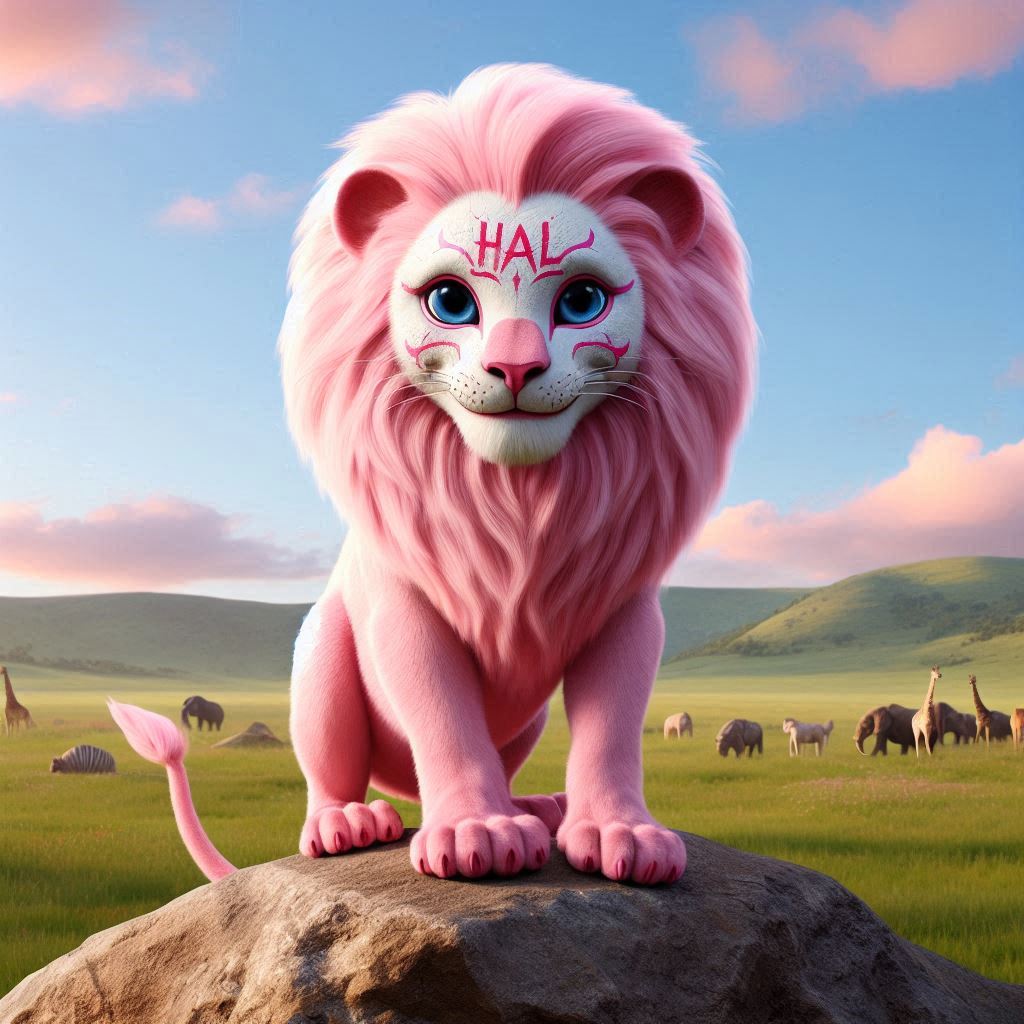 フォトリアル 巨大な岩の上に座っている女性的な淡いピンクのワイルドなライオン たてがみがピンク 「HAL」のテキストがライオンの額に赤字で表記 おでこに「HAL」 大きな赤丸チークがほっぺたにある 赤ほっぺ 顔の模様が白いドクロ風 淡いピンクのライオンの体の模様がスケルトンの白い模様 鮮やかな色調 体のラインが美しいライオン 遠くの背景に仲間の動物の大群、タカ、キリン、ゾウ、トラ、バッファロー、ゴリラ 緑の草原 青空