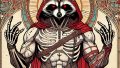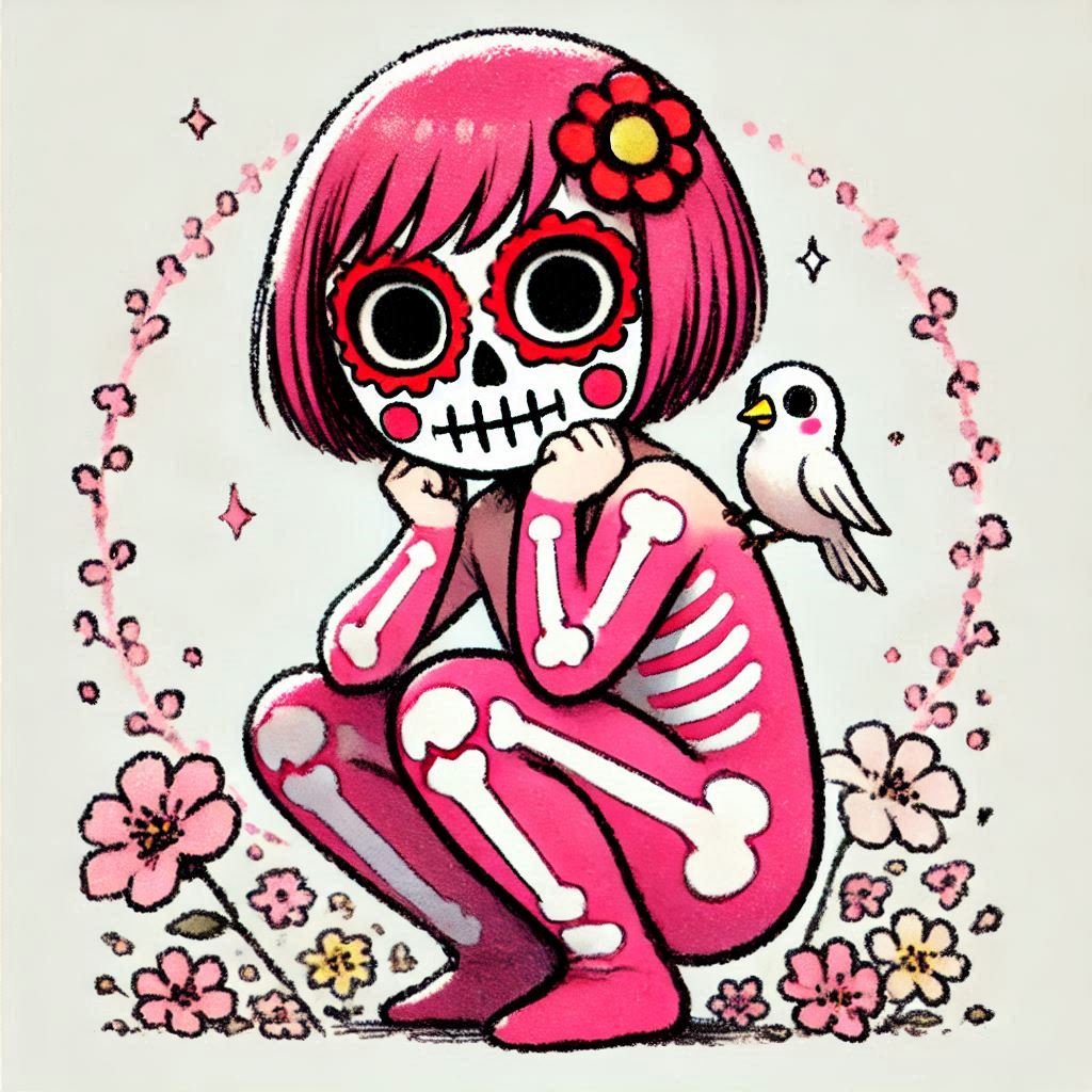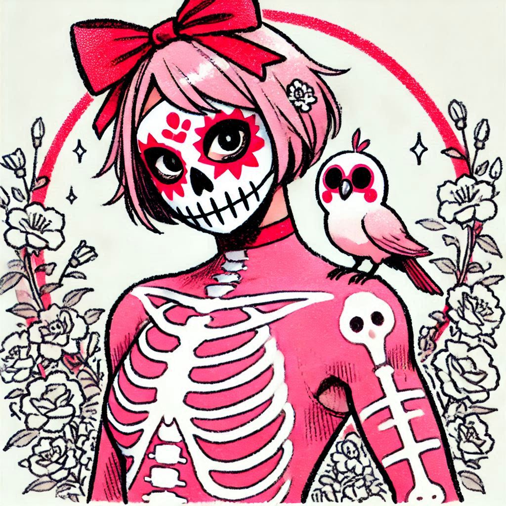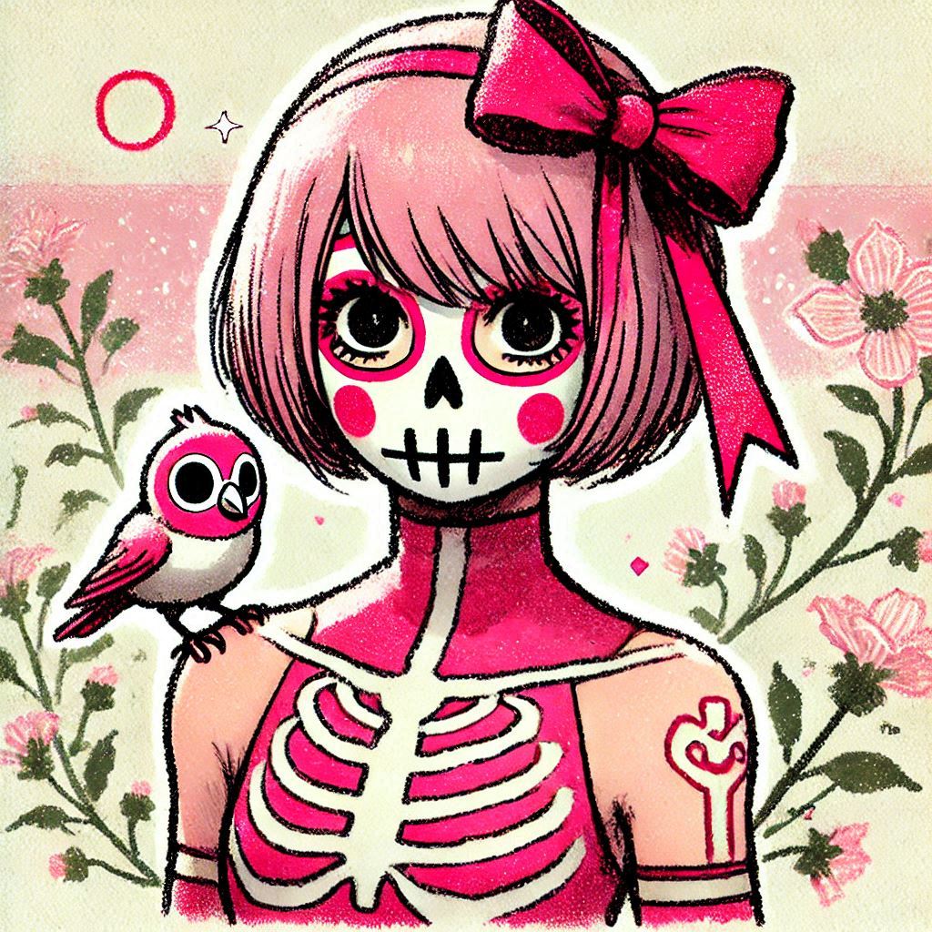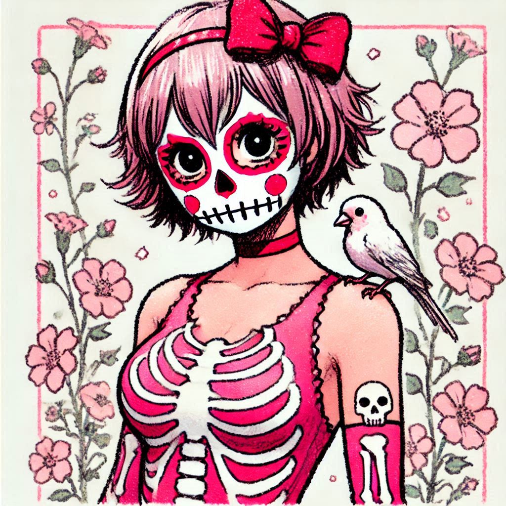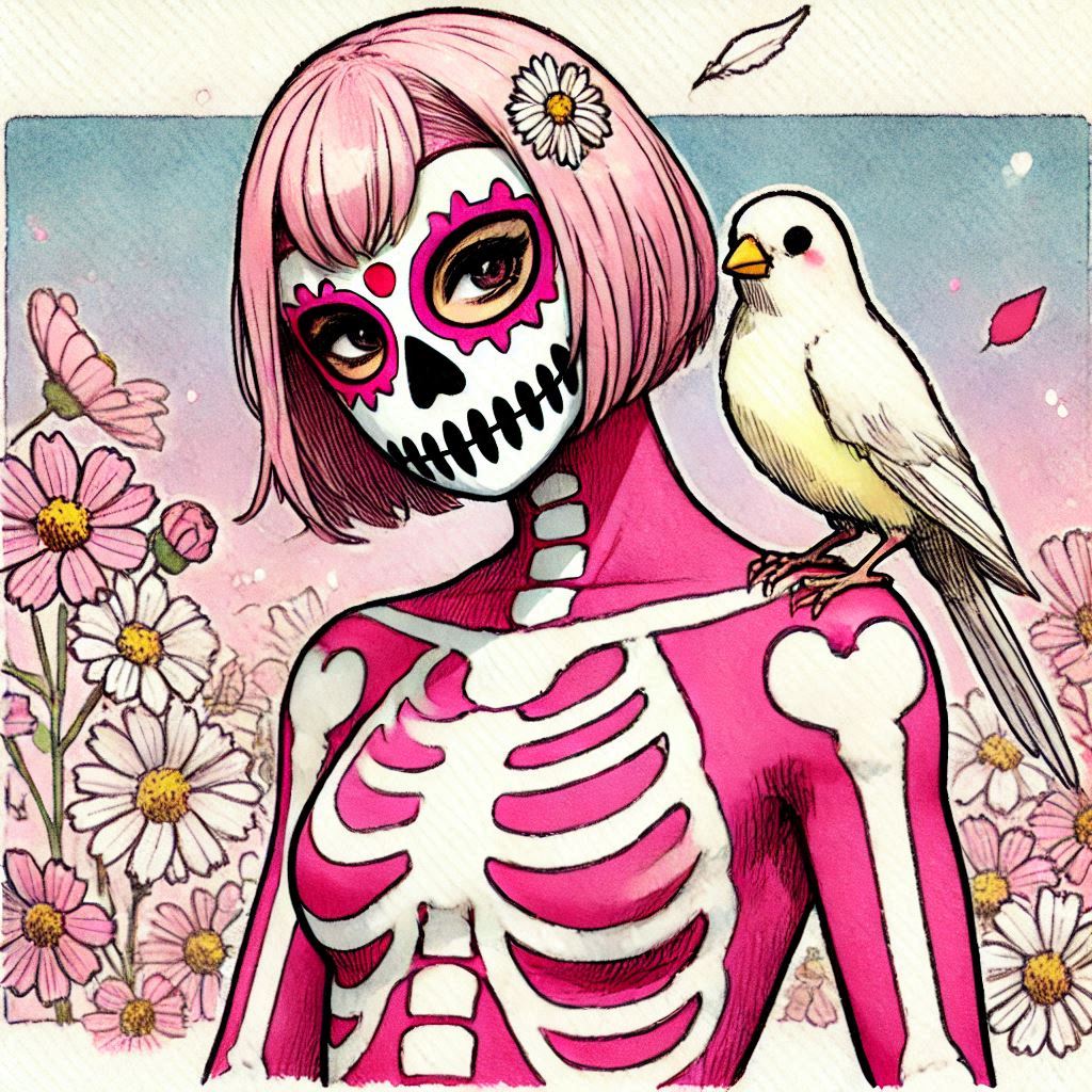 荒木飛呂彦風の漫画ラフ画、女性レスラー、ピンクのスケルトンタイツ、ドクロマーク、レスラーマスク、覆面レスラー、覆面マスク、頬が赤丸ほっぺた、ホッペタが赤くて丸い、ほっぺたレッド、全身、レスラーブーツ、フルボディ、肩に小鳥、1人、水彩カラー、周りにフラワーフレーム