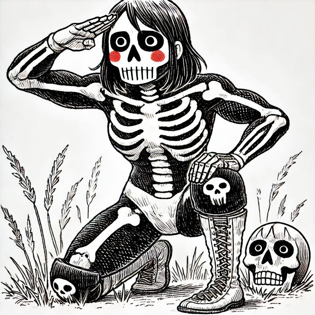 荒木飛呂彦風の漫画ラフ画、女性レスラー、スケルトンタイツ、ドクロマーク、レスラーマスク、覆面レスラー、覆面マスク、敬礼立ち、頬が赤丸ほっぺた、困った顔のタレ眉、眉毛が垂れ下がっている、ホッペタが赤くて丸い、ほっぺたレッド、眉毛が極太、ゲジゲジ眉毛、太い眉毛、ブリアナギガンテ、ほぼ黒目、全身、レスラーブーツ、フルボディ、草原で、1人ぼっち、水彩カラー、