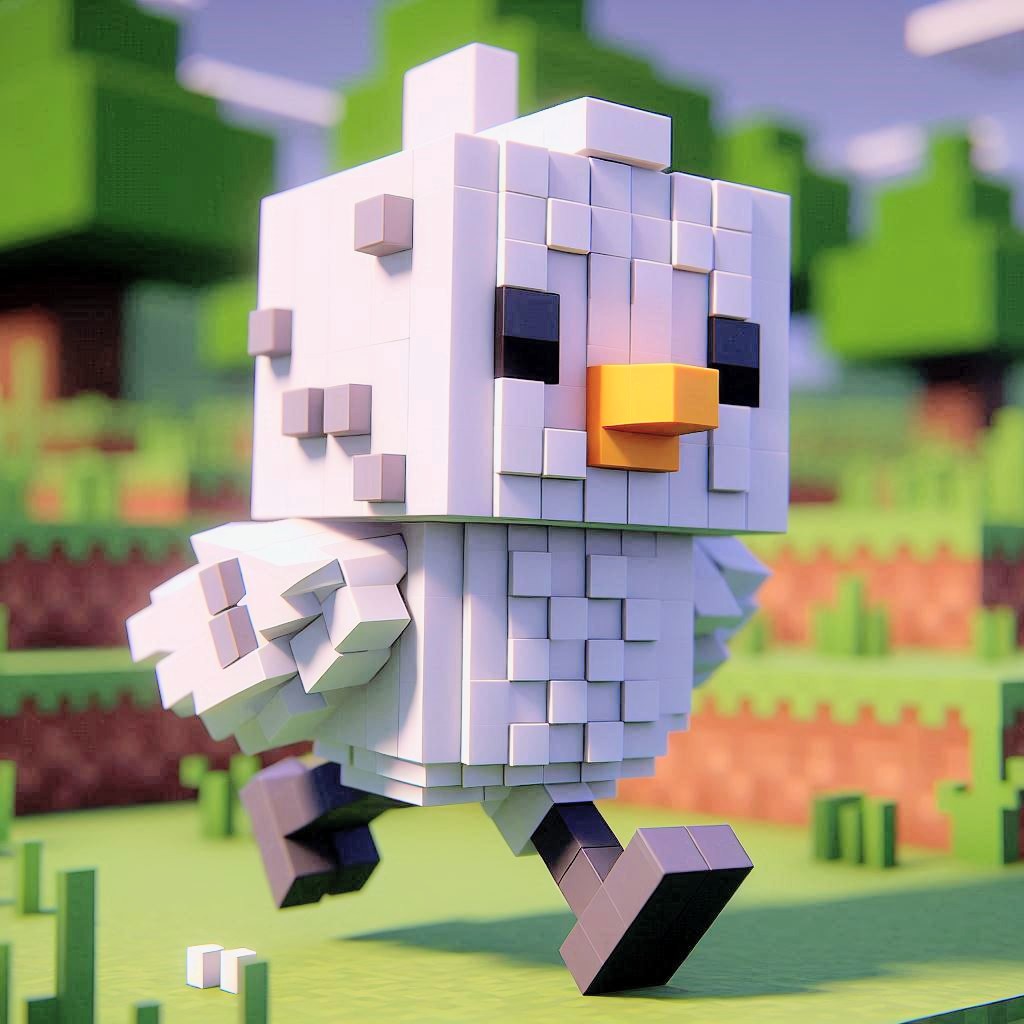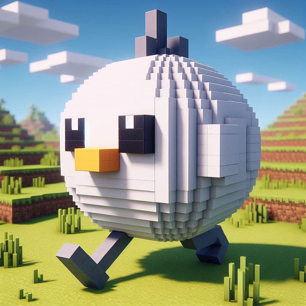 mii:ぴーちゃんマイクラ mii X Facebook はてブ LINE コピー 2025.05.14 プロンプト: マインクラフト風の大きなキューブで構成されたCGで、球体の頭と体の境界がくびれがあり、全身が白く、グレーのトサカが付いていて、小さい黒い目と小さい黄色いクチバシが並んでいる小鳥のキャラクター 歩く 背景は大きなキューブで構成された草原
