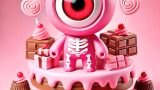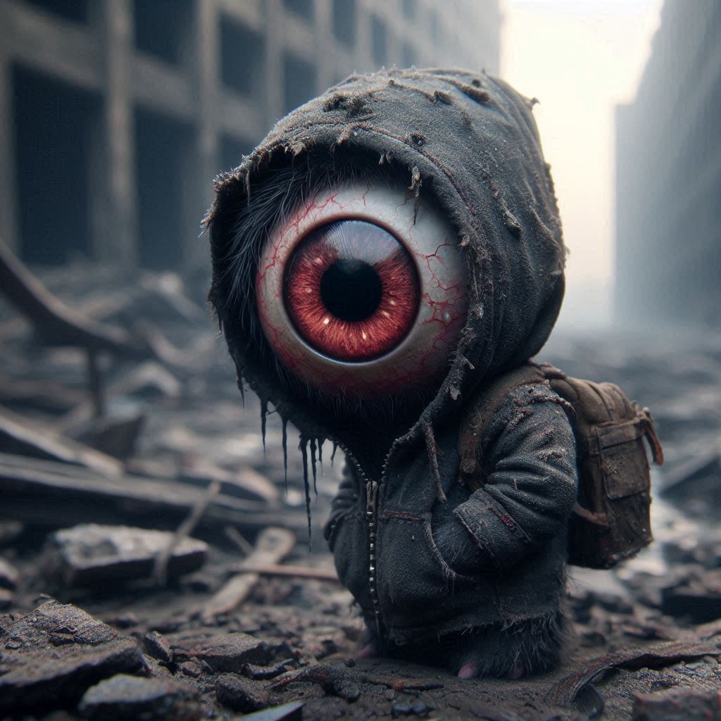 フォトリアル 現実的 写真 ひとつの大きな赤い目玉に小さな体の妖怪 不健康な感じ 黒いフード付きの汚れた服 一匹 背景は廃墟