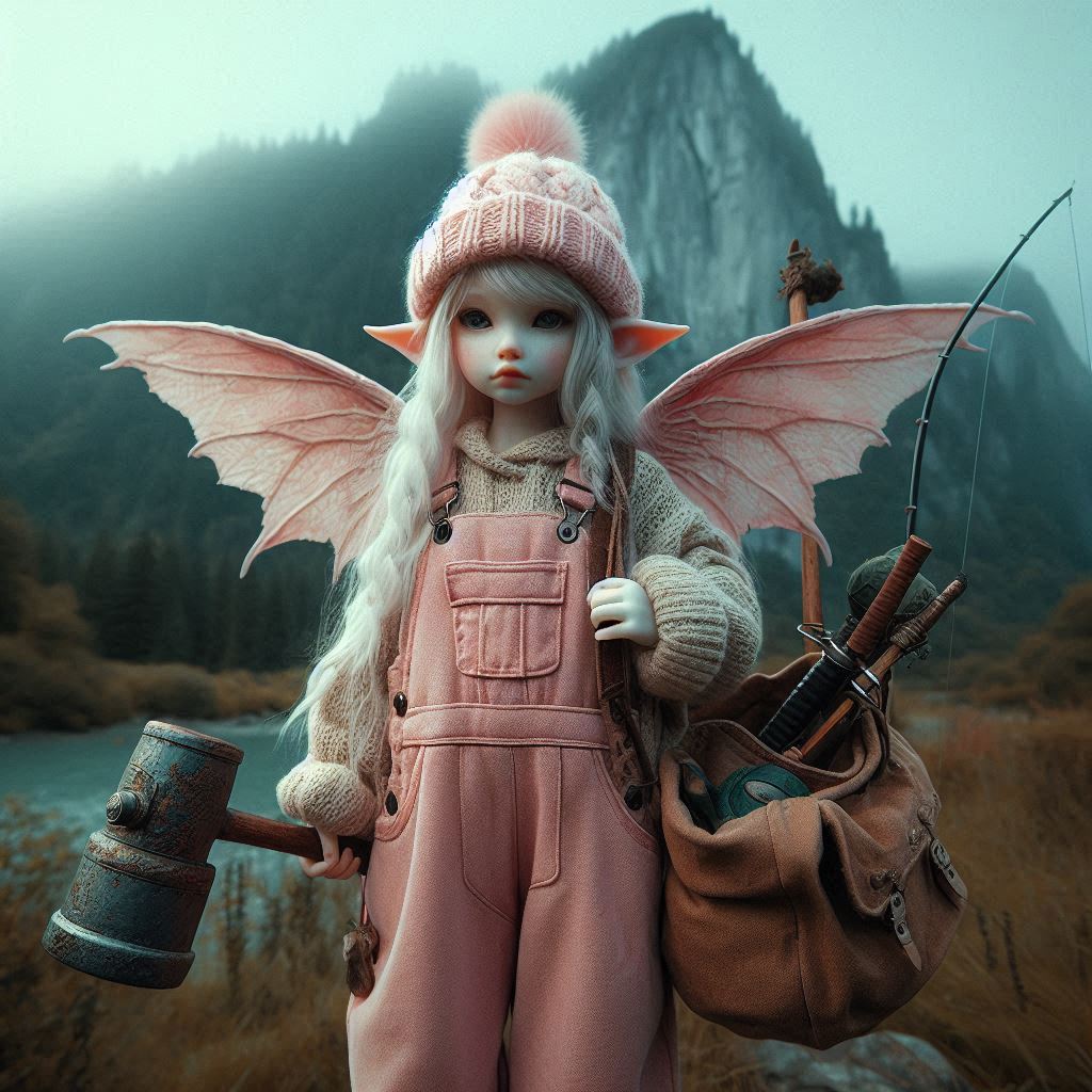 miu:エルフのモンハン miu X Facebook はてブ LINE コピー 2025.03.242025.04.12 プロンプト: フォトリアル 現実的 写真 女性的な妖精 白い小さな顔 スリムなモデル体型 背中に天使の翼 淡いピンクのフード 巨大なハンマーを持っている 淡いピンクのオーバーオールにポケットがたくさん付いている オーバーオールは大きなサイズ 一人 大きなショルダーバッグを肩にかけている 背中に釣り竿 背景は荒野 遠くに岩山のように巨大なドラゴン