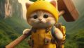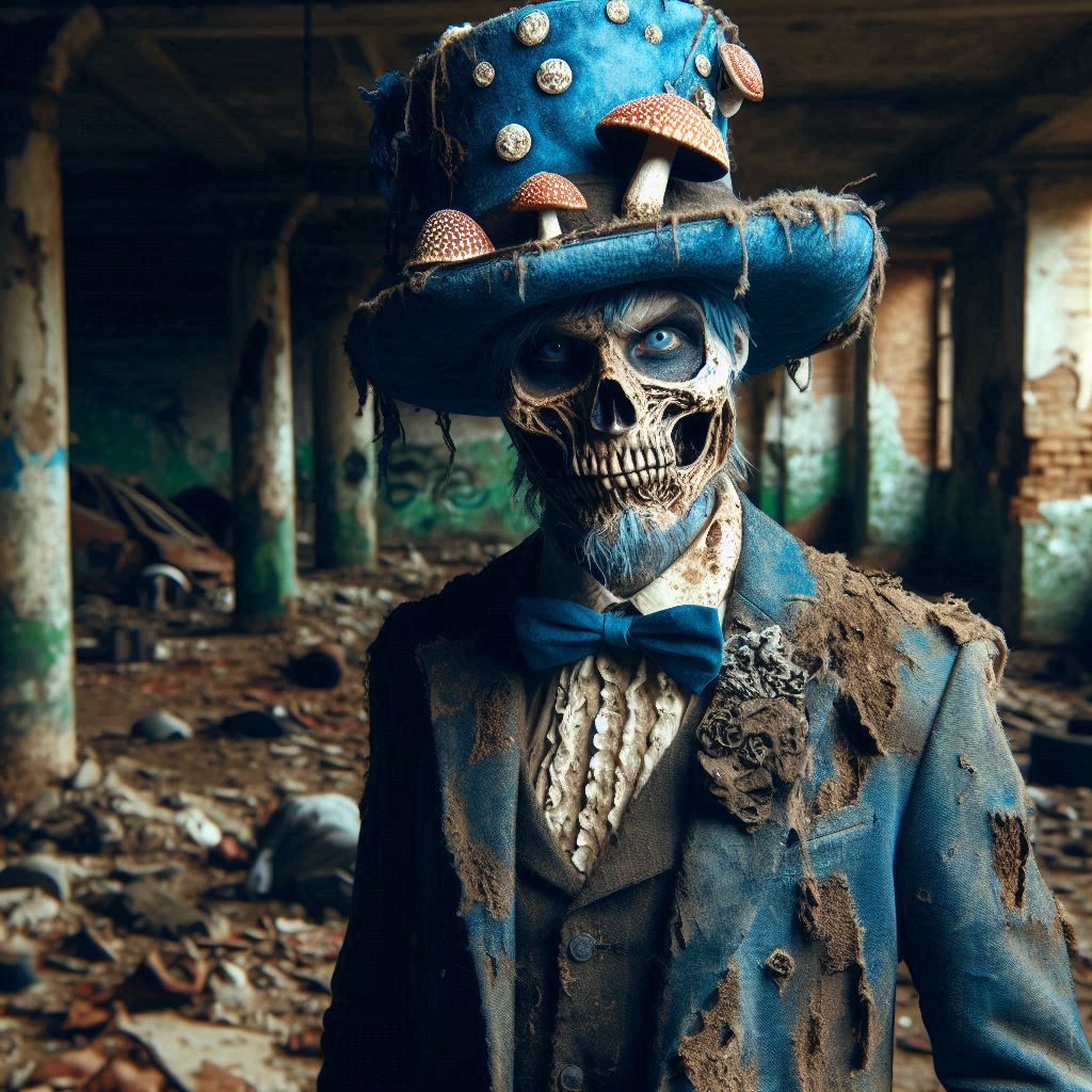 フォトリアル 現実的 写真 キノコが生えた青いシルクハットの紳士のゾンビ ドクロマスク 蝶ネクタイ 汚れたボロボロの青いスーツ 背景は廃墟