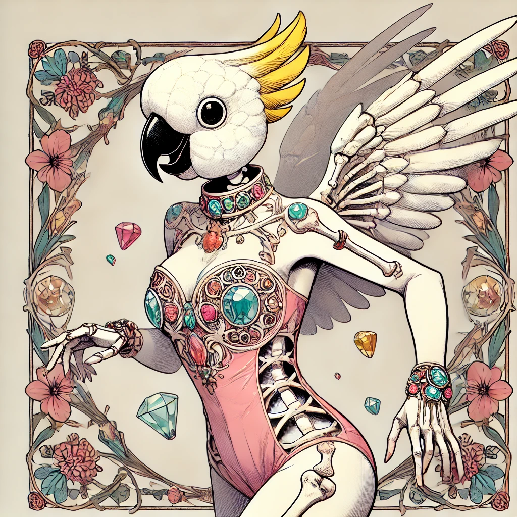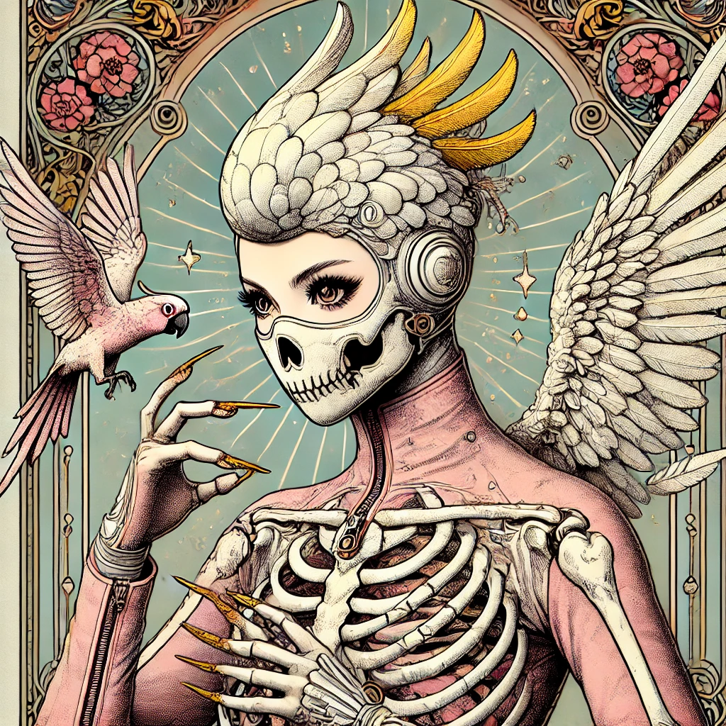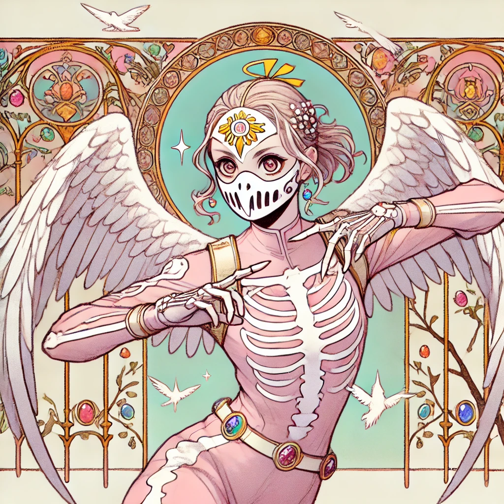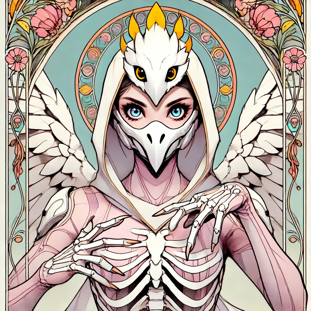 キレイな美少女。トサカに黄色い冠羽が付いたモダンなデザインの目の無い白いオウム風の小さい仮面女子レスラー。大きくてキラキラした可愛い両目が見えている。クールジャパン劇画漫画の手描き感が残るラフ画タッチ。優美で繊細なタッチ。全然的なディティールを細かく。グラデーションを使わないくすみがかったシンプルなパステルカラー。モデル体型。無数の宝石アクセサリー装飾が付いた淡い桜ピンクの全身タイツで骸骨スケルトンタイツが施されている。天使の翼が左右2つ付いている。1人。両手の爪ネイルで攻撃している。バストアップ。背景にカラフルなアール・ヌーヴォー風のお花の額縁フラワーフレームを付ける。肩に鳥を描くな。飛んでいる鳥を描くな。鳥を一切描かないこと。背景や装飾、人物以外の要素に鳥を含めない。鳥を完全に排除すること。仮面はオウム風デザインだが、それ以外の箇所に鳥の要素を描かない。